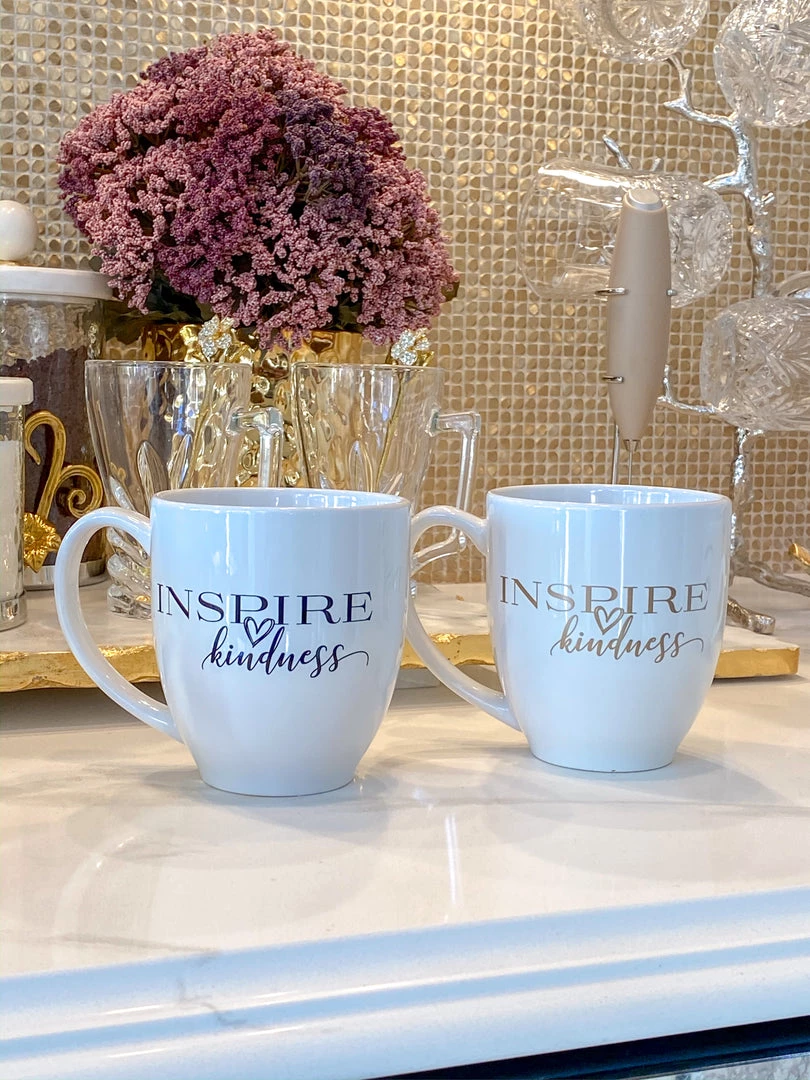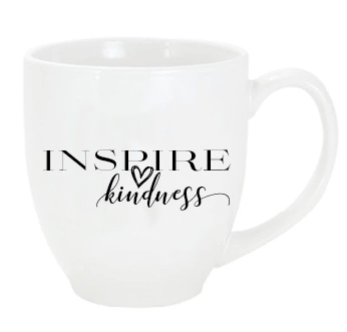 “Inspire Kindness” white bistro mug. Choose between gold and black text.