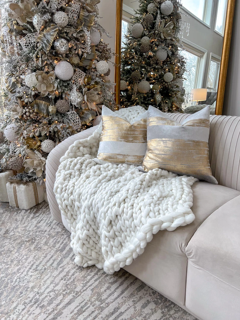 Description: This oversized knitted throw will make a beautiful statement on your couch or side chair. Super soft and super cozy!