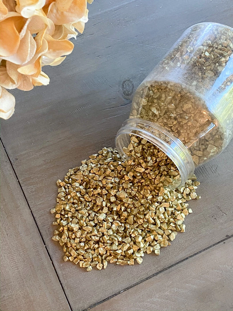 Description: This fine crushed glass in gold is a perfect filler for any vase!