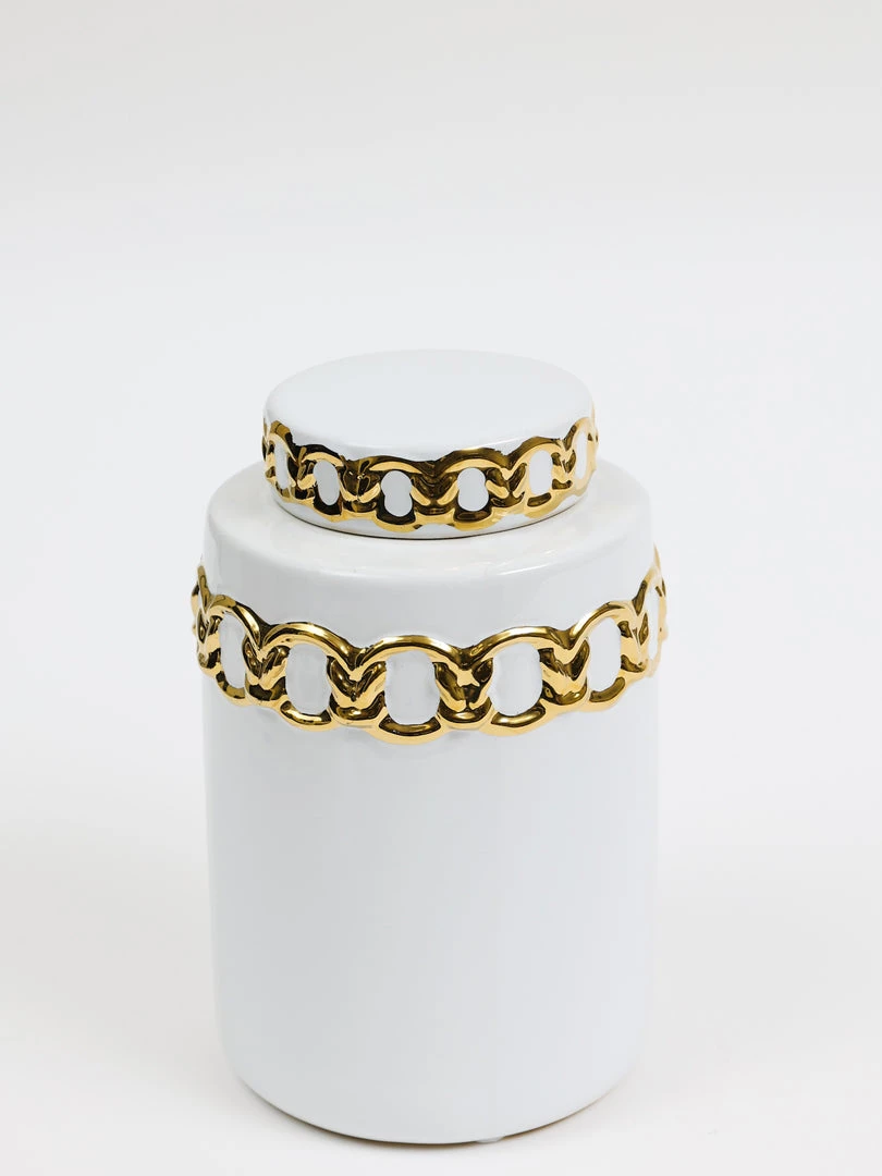 Description: This gold and white lidded jar is a stunning design and ties back to the ginger jar with the same gold chain link design! These will add a brilliant touch of glam to your kitchen counter or living room! These can be used as a vase with your favorite floral or in the kitchen.