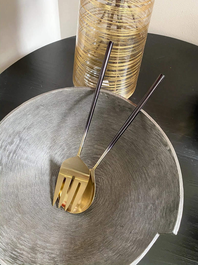 Salad servers with ombre handles and gold servers.