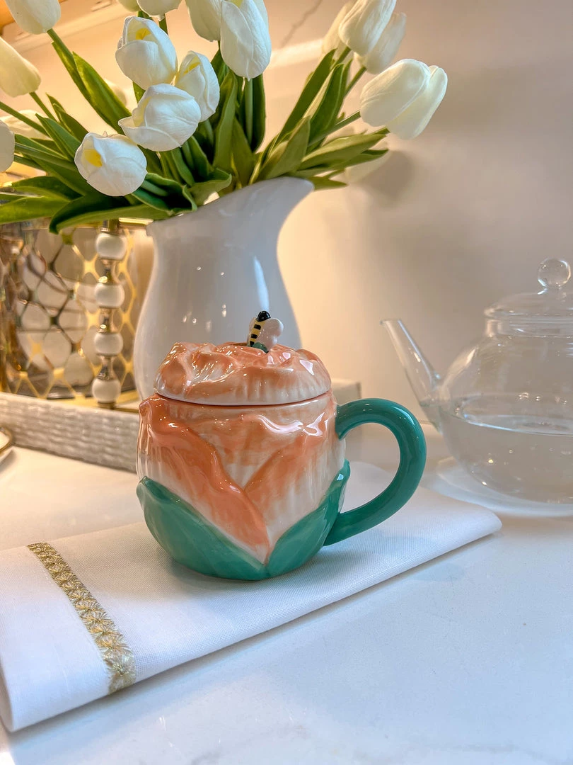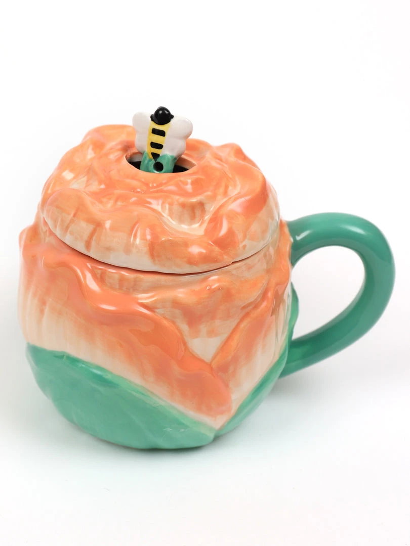 Description: This rose mug is such a cute addition to your mug collection! It featues a lid and a small bee spoon.