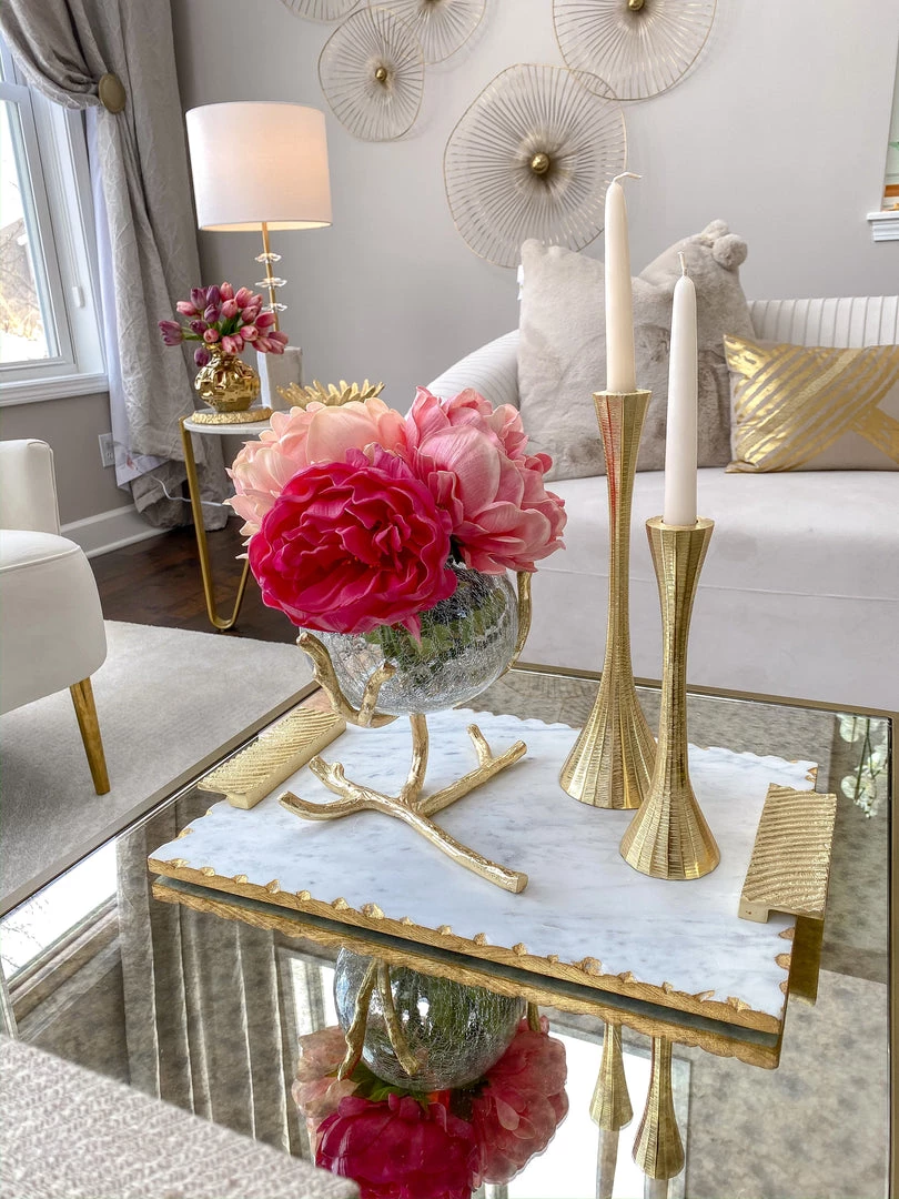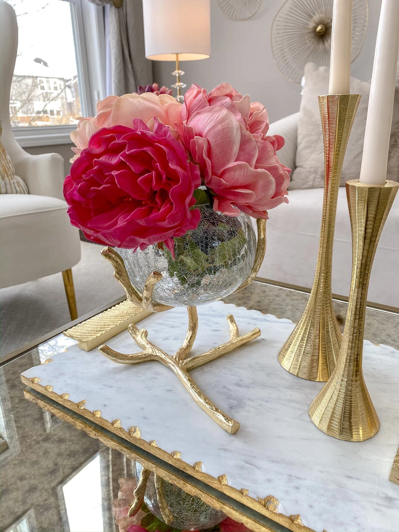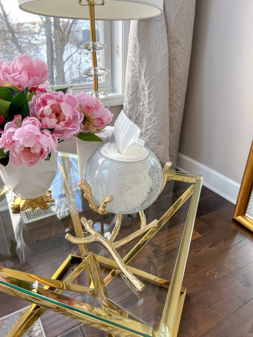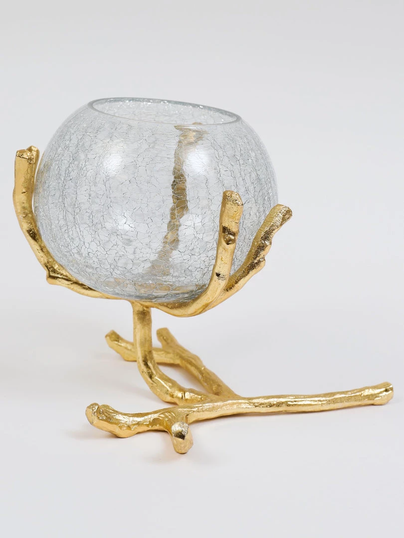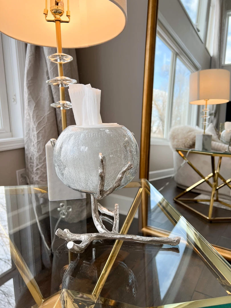 Description: Available in silver and gold, this beautiful piece is so versatile. It is sure to add some delight and whimsy to your home! The metal branch stands rests with a large crackled glass bowl to perfectly capture the light of your favorite candles or house beautiful floral arrangements as well! This makes the perfect tissue holder but is elegant and adds some style.