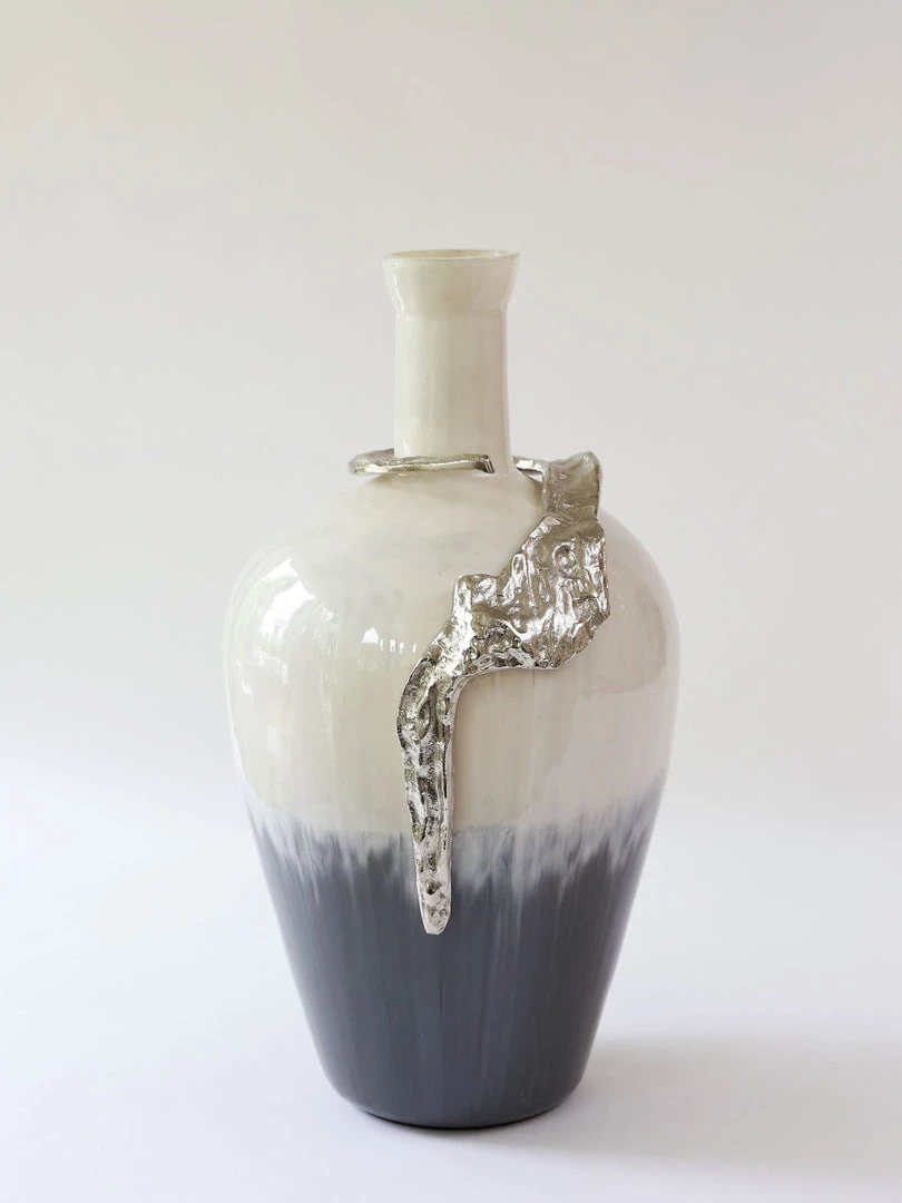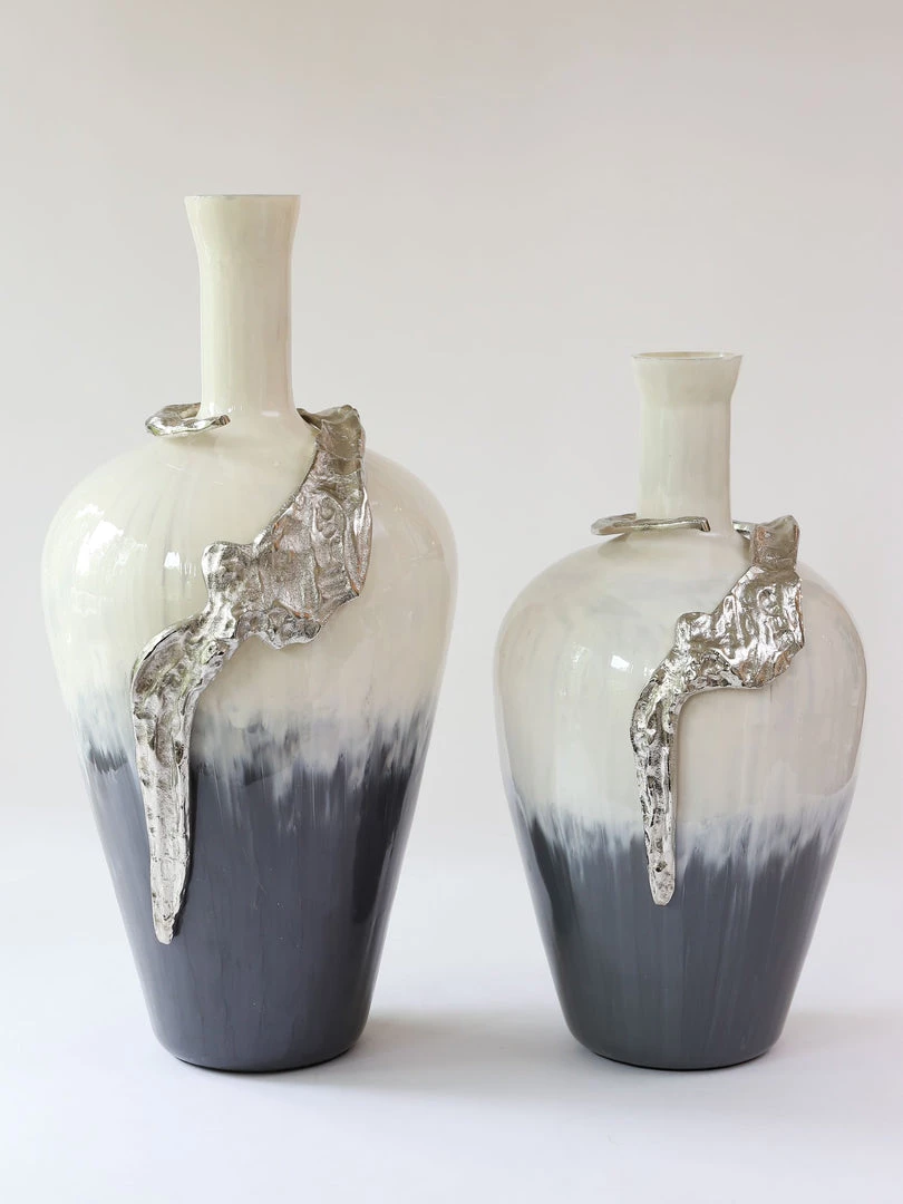 Description: This stunning vase features a very unique design! The glass vase is outlined in a cream and grey pattern, and there is an added metal abstract sculpture with the piece! This design is sleek and modern and elegant in ever possible way! Available in 2 sizes!
