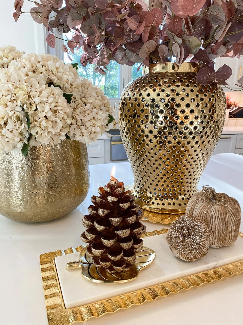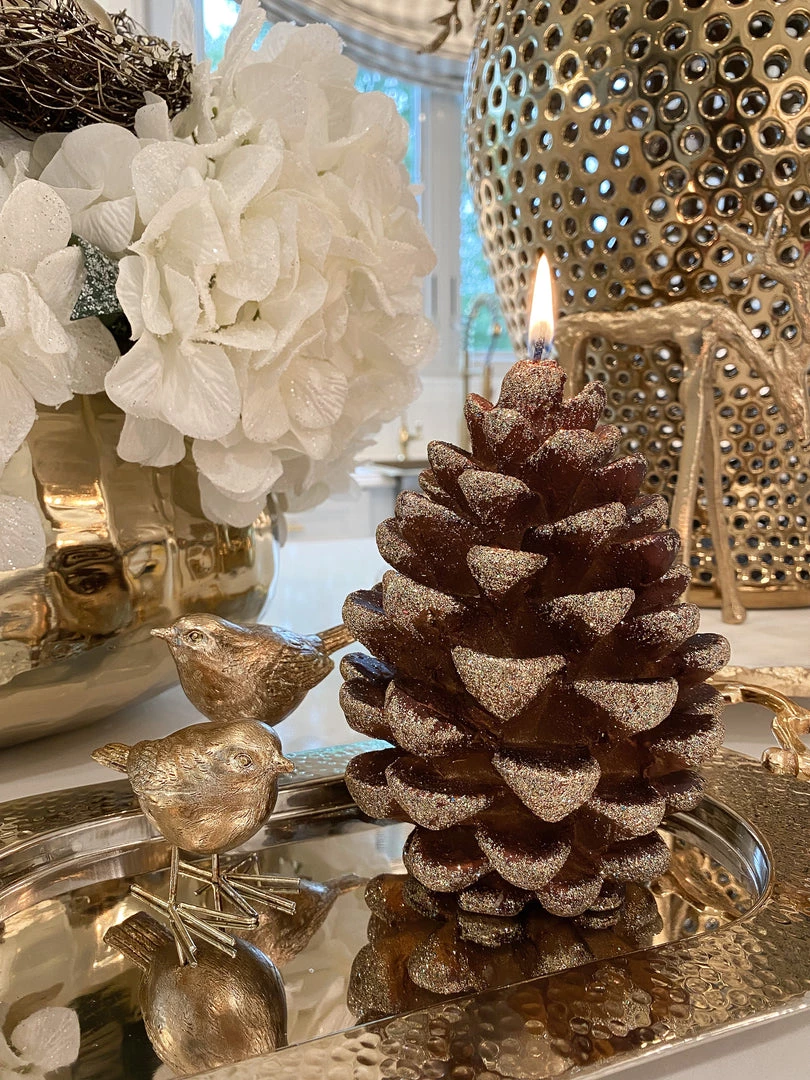 This pinecone shaped candle is an elegant way to style your centerpiece or mantle for the holidays! style on a candle holder or under a cloche.