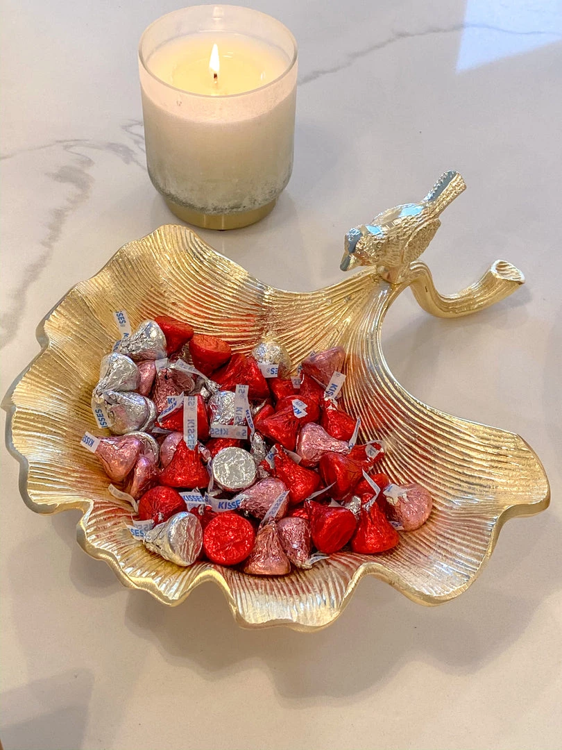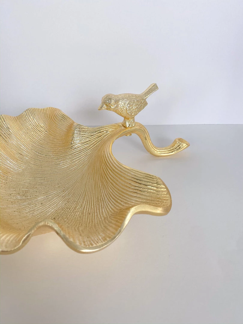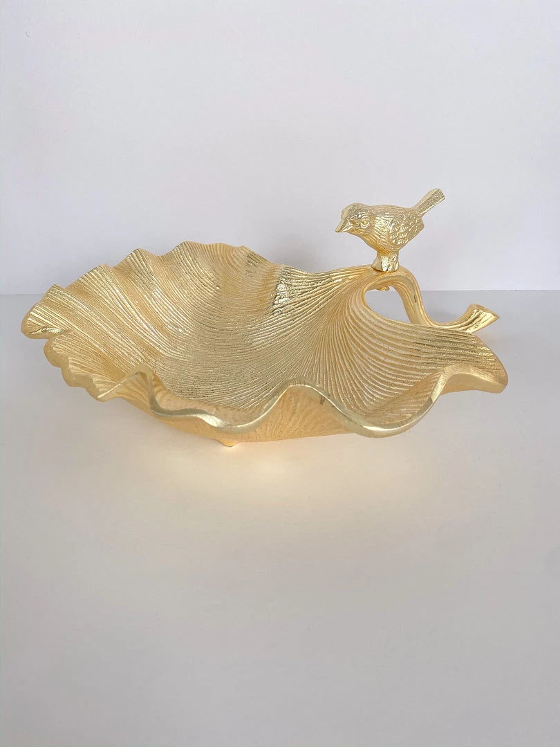 Description: Add natural beauty to your glamorous home decor! This leaf bowl features a small golden bird birched over your favorite fillers and will look stunning in your home!