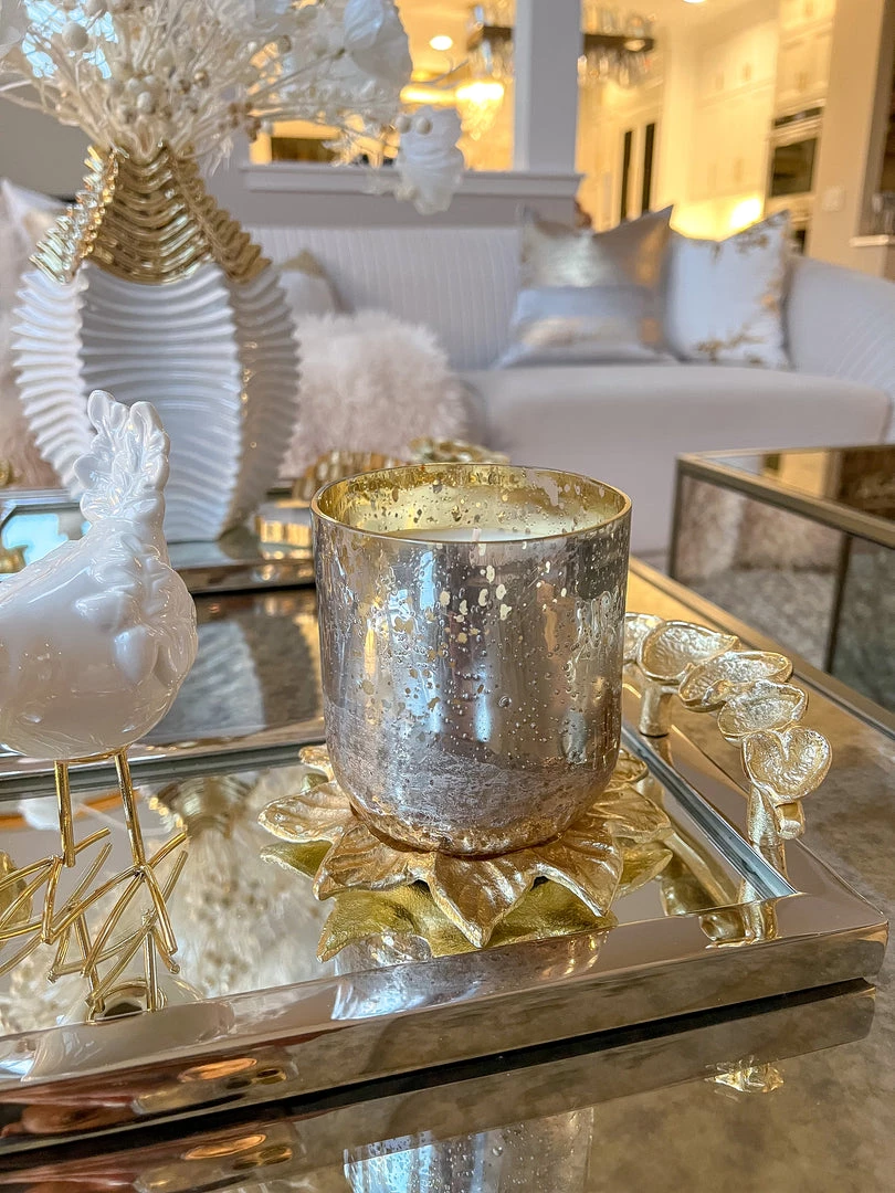 Description: This gold mercury glass candle will fill your home with a soft glow and beautiful scents of rich oak moss, cinnamon, and eucalyptus.