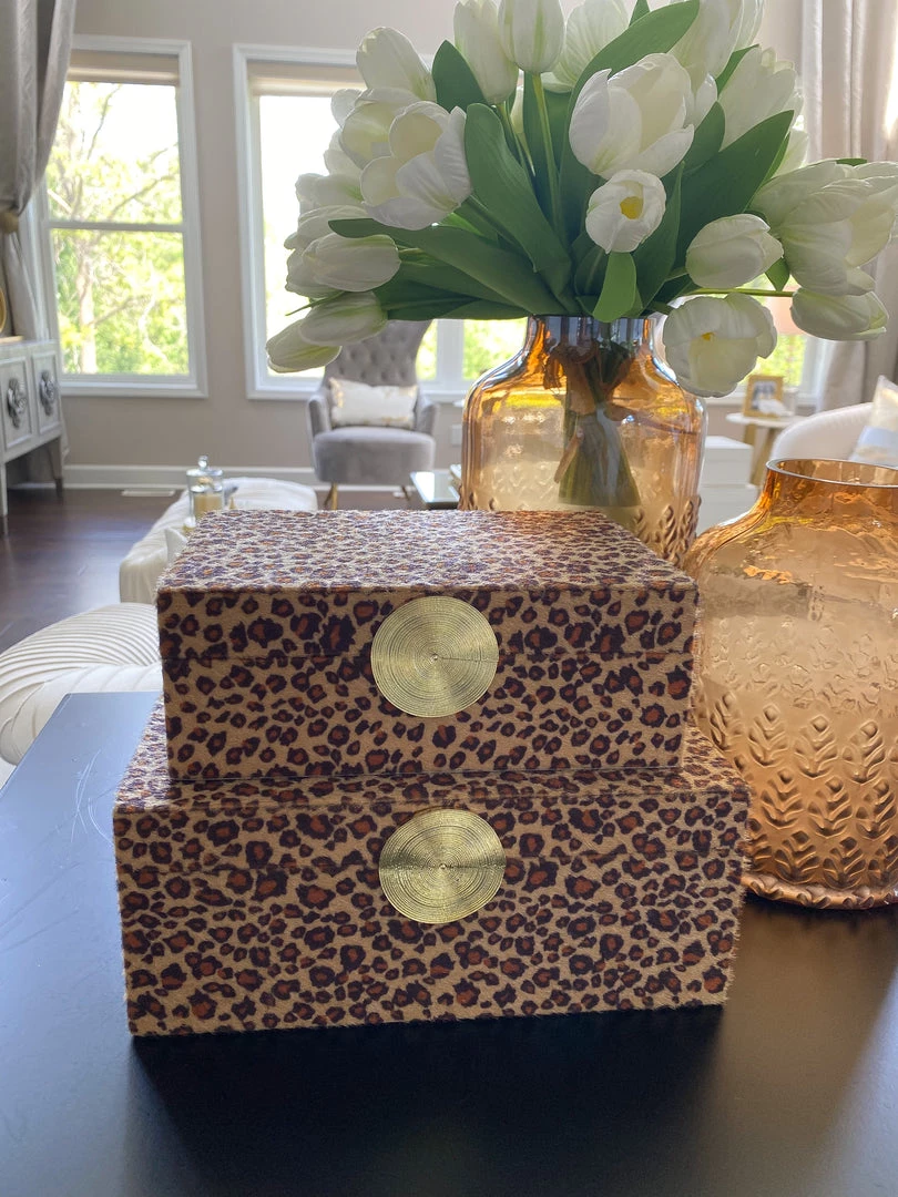 Description: This box set is perfect for the fierce home decor! The set features a velveteen fabric with a dark leopard print pattern. The gold medallion on the front ties these back to all of your gold decor. Can be styled together, or separately, and they are great for storing things like remotes and other items.
