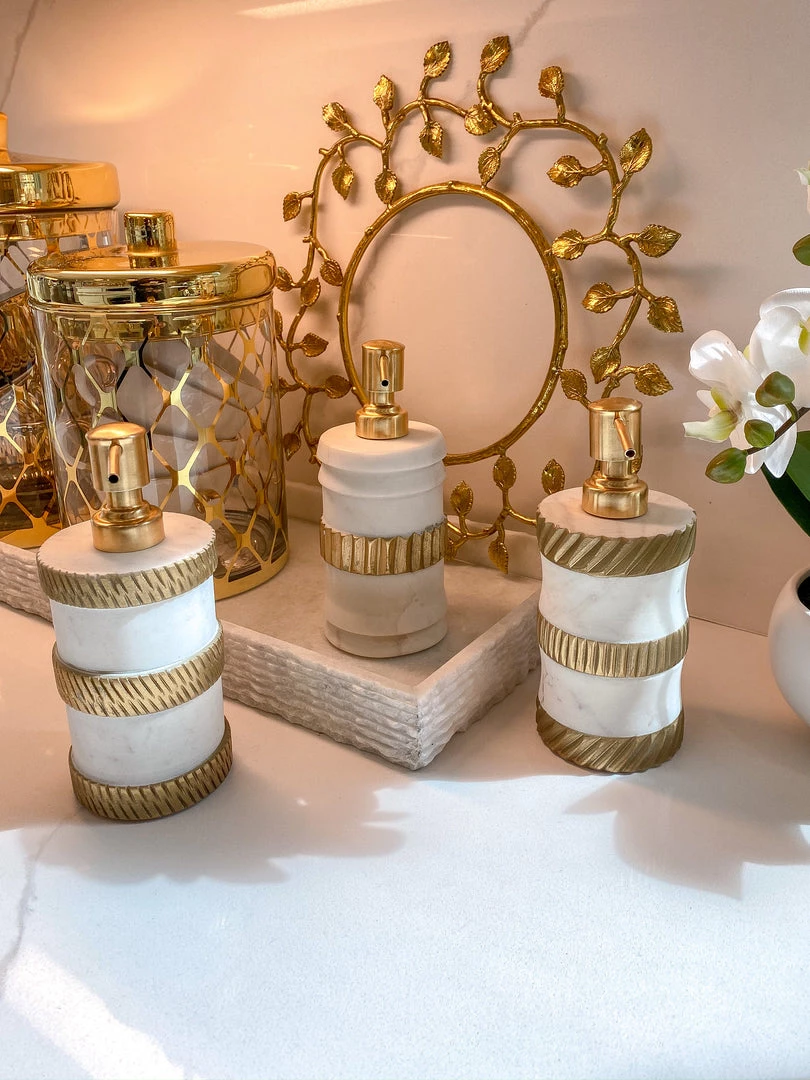 Description: This marble soap dispenser features a gold patterned stripe that is stunning. This will take your kitchen or bathroom to the next level!