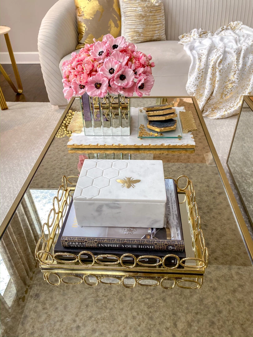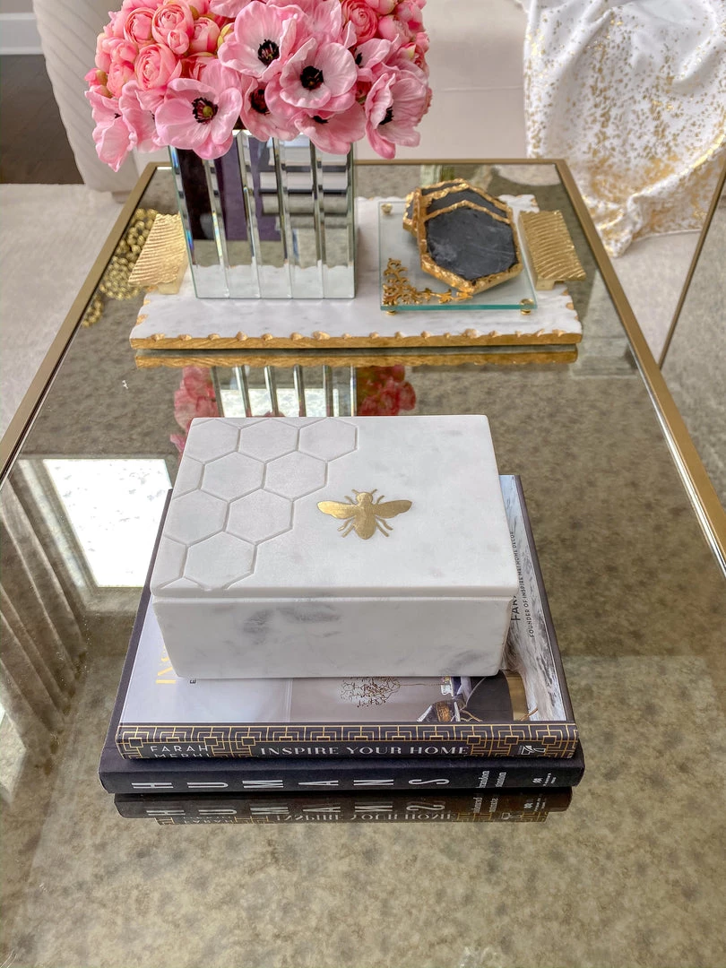 Description: This beautiful marble storage box is sweet as honey! Featuring a honeycomb detail and a small golden bee on the lid, this is a stunning and stylish piece that will enchant your home!