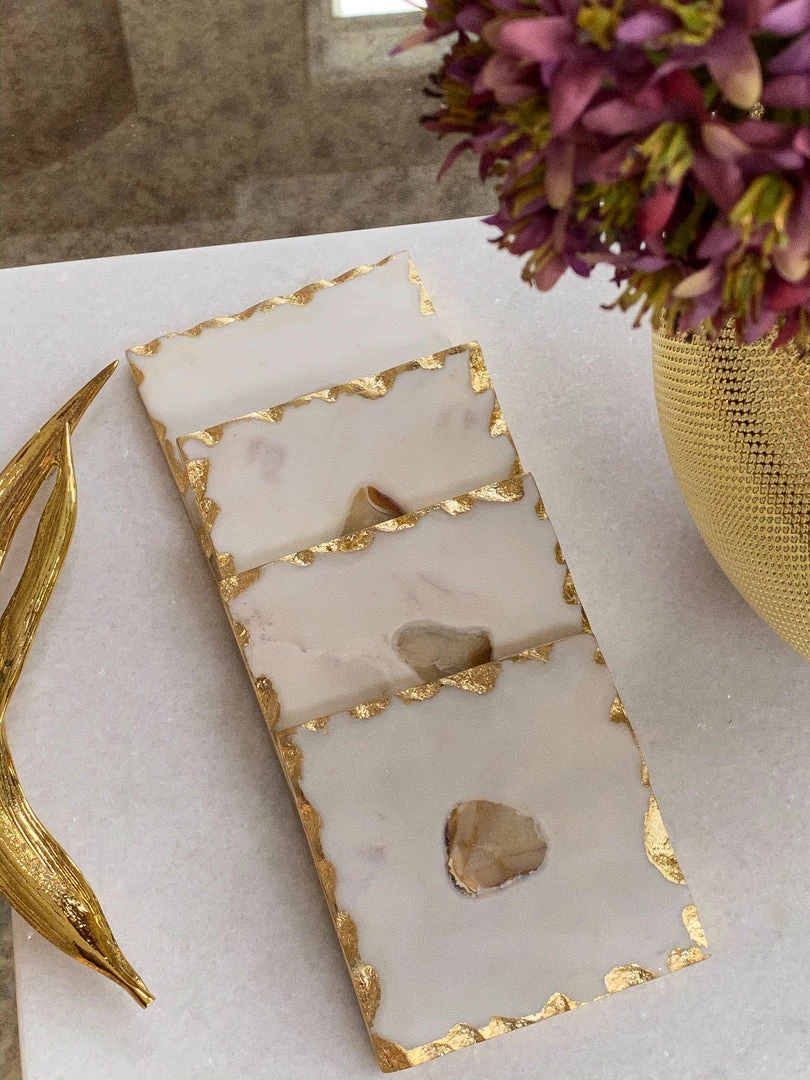 This set of 4 coasters feature an elegant gold detailed edge and an intricate agate center. Perfect to display on a tray or to use with your favorite glass.