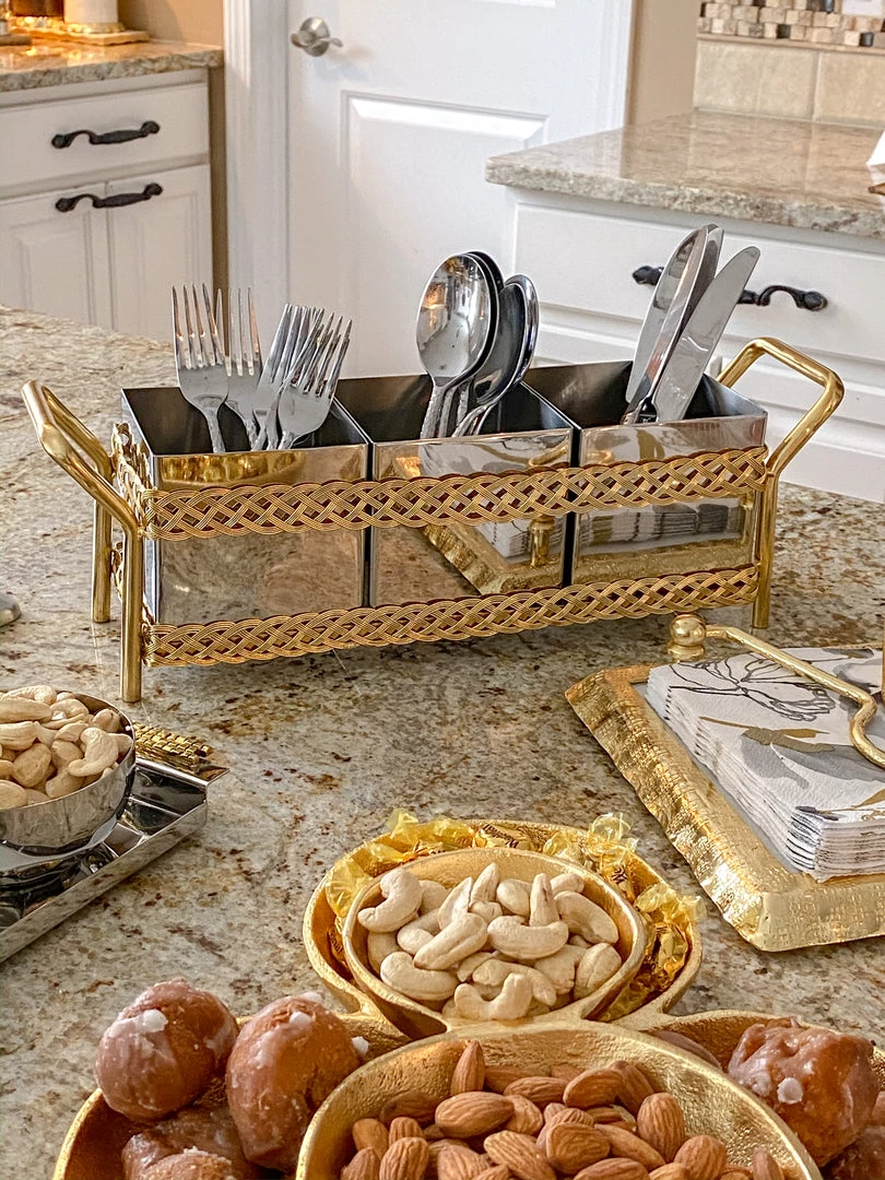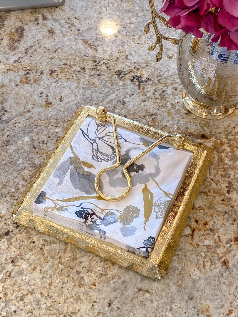 Sleek and elegant marble and gold napkin holder. This piece matches your favorite Marble and Gold Hammered Jars.