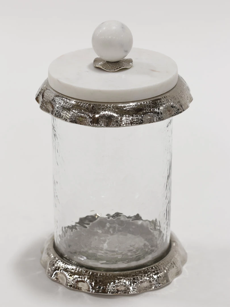 Beautiful glass container with real marble lid great for storing snacks, treats and anything that fits in the variety of three sizes!