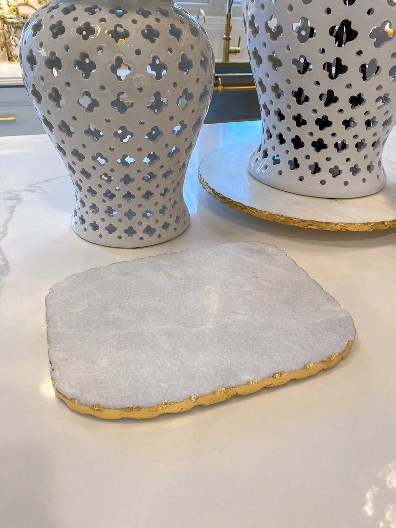 Description: Create a beautiful spread with this beautful marble cheese board! Available silver and gold trims!