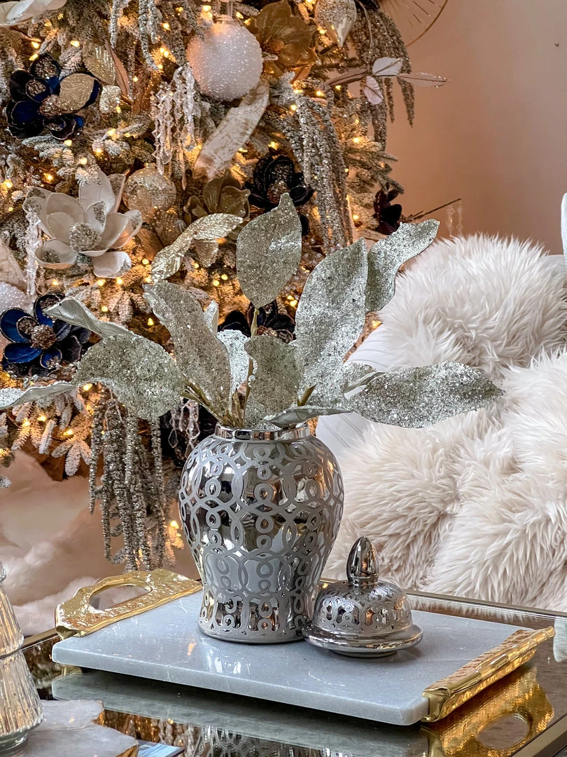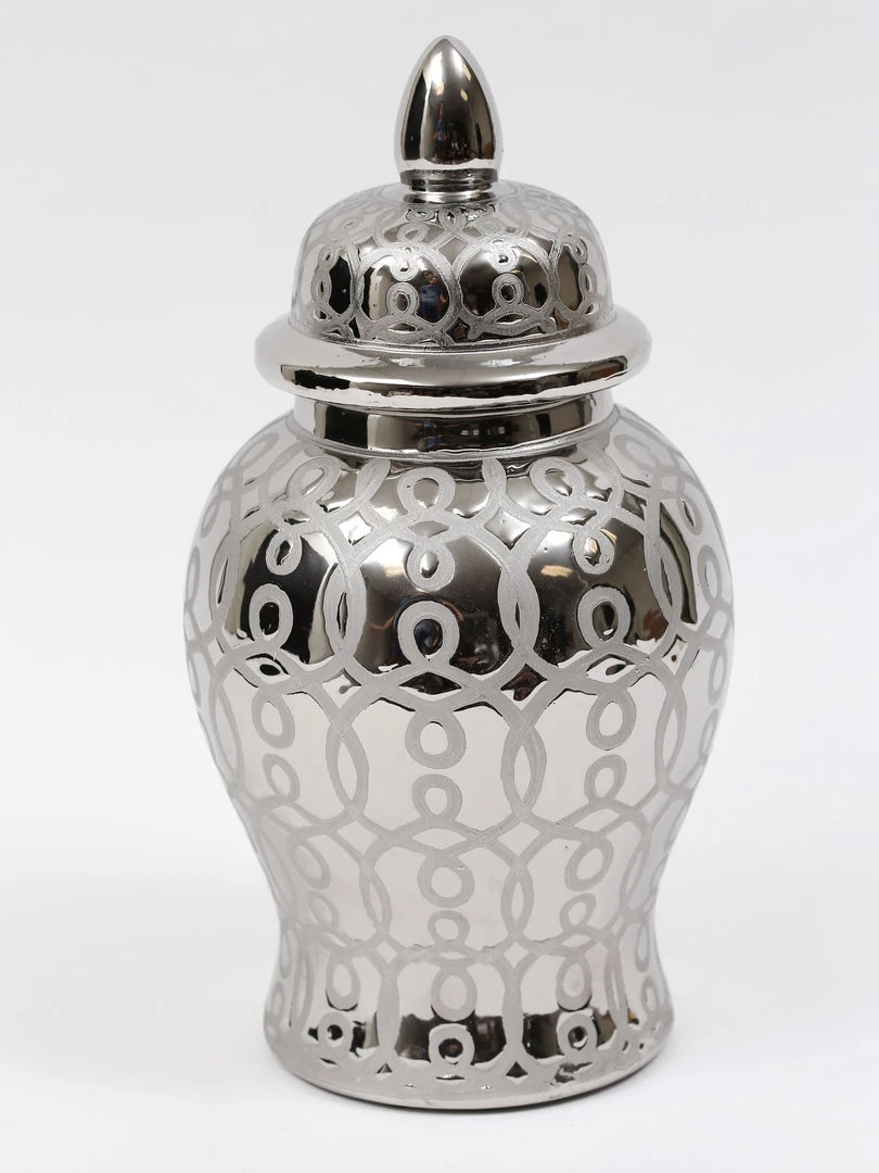 Description: This shiny ginger jar is a fun twist to a favorite design! We love the shiny silver sheen that it gives off. This piece is perfect for any decor!