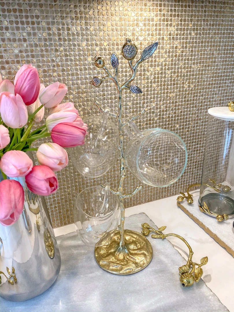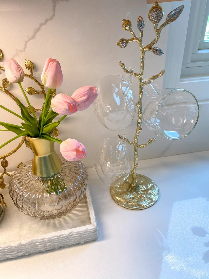 Description: This stunning mug tree is perfect for your coffee station! Able to hold up to 4 large coffee mugs, this elegant tree design is topped with delicate leaves and fruit buds to make an organic and nature look!