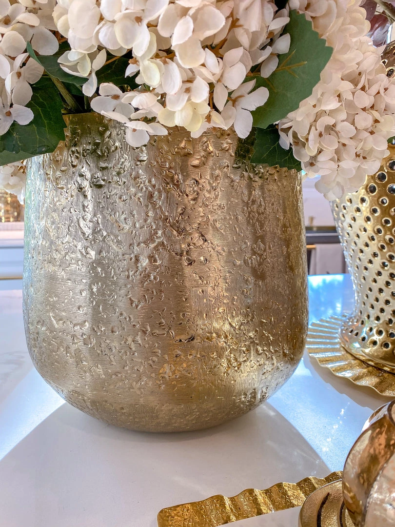 Description: This stunning planter is beautiful and functional and offers a great way to display your favorite plants! This planter is not only completed with a gorgeous hammered finish, but also features a metal insert to protect the interior and your plants!