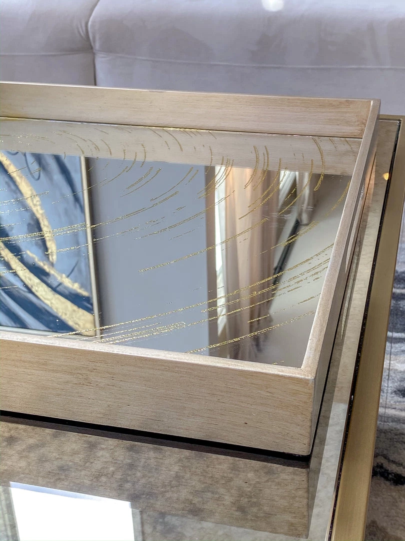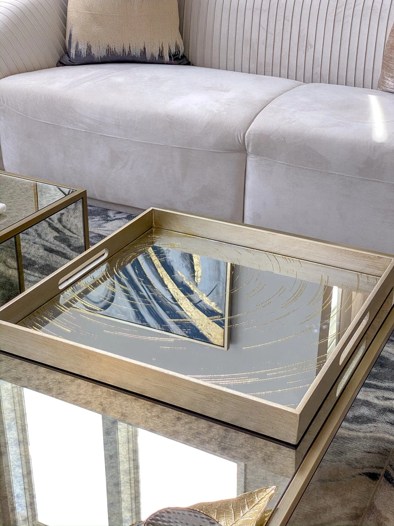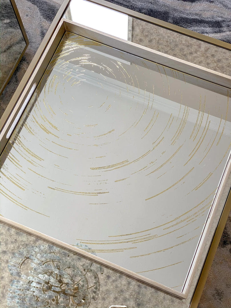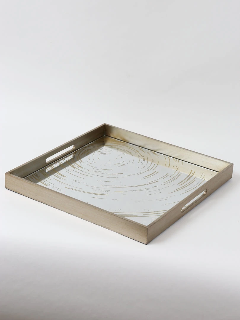 This oversize tray features a mirrored base with a small circle pattern. It is a very substantial piece and is perfect piece for your coffee table