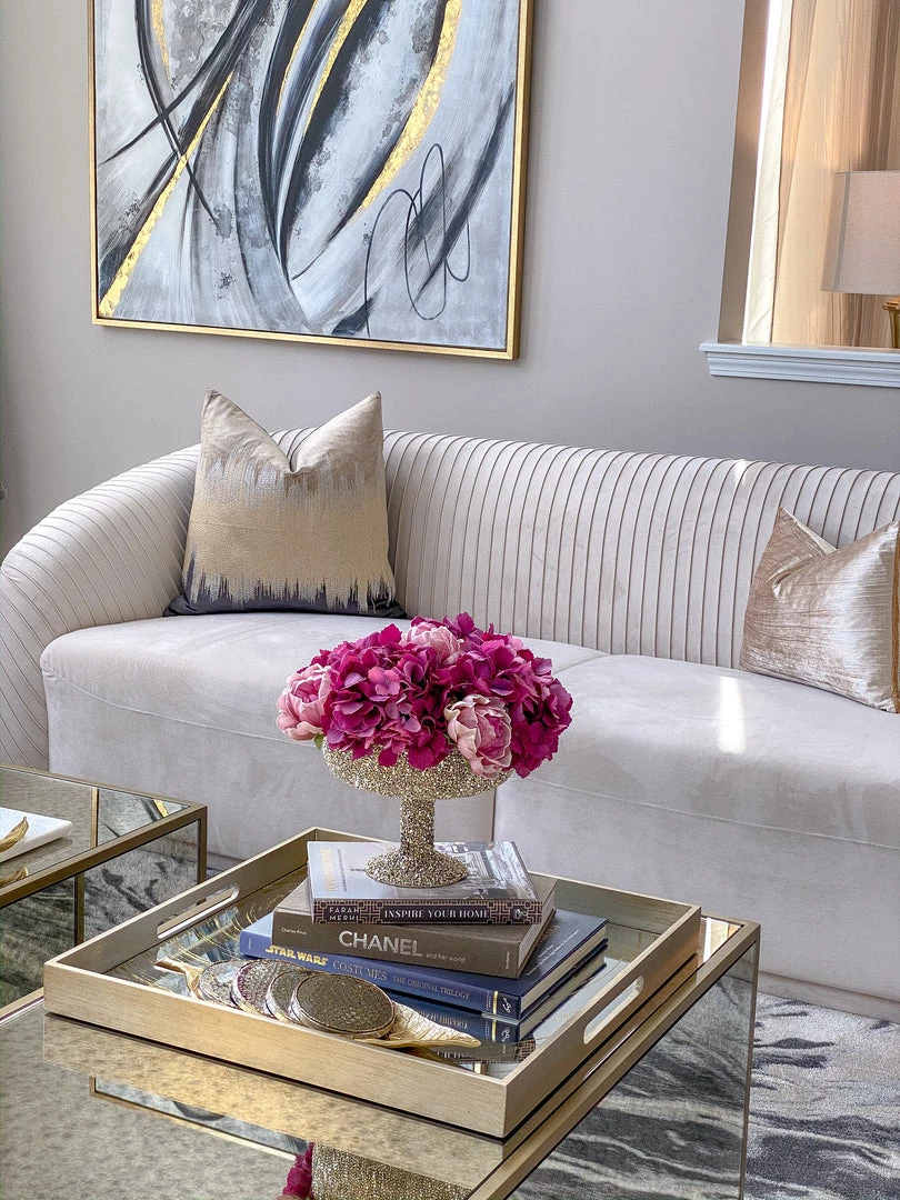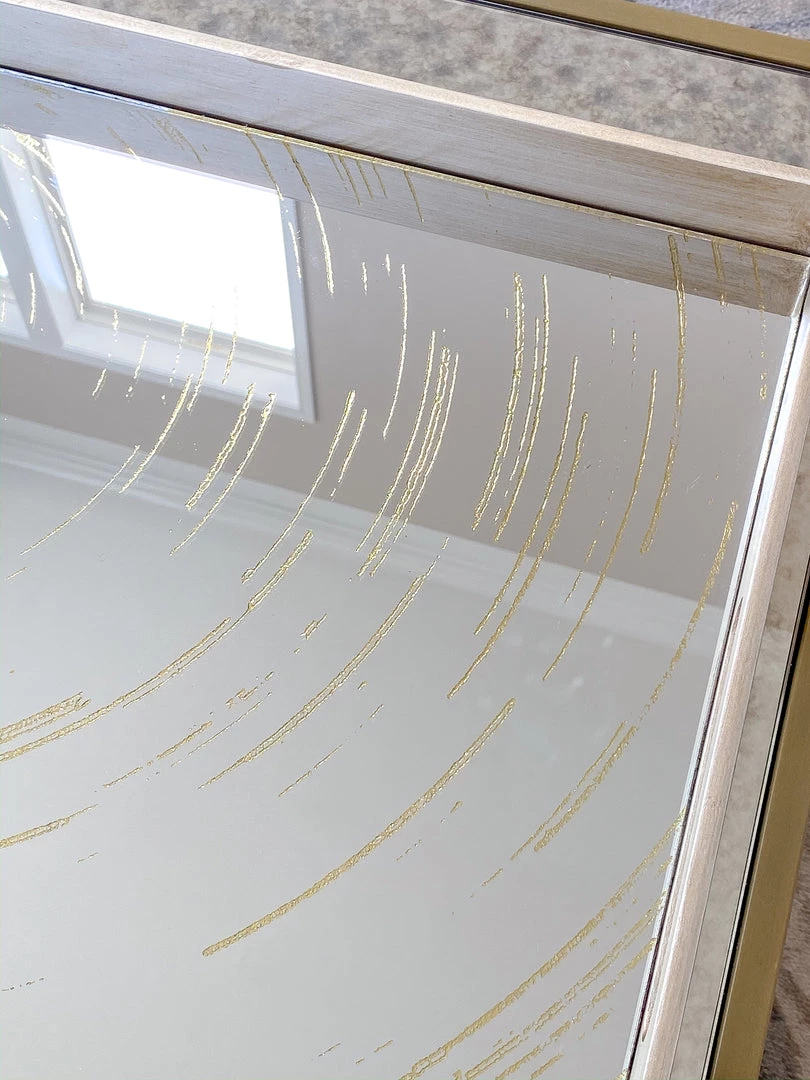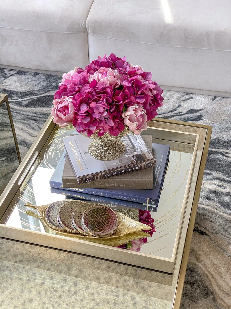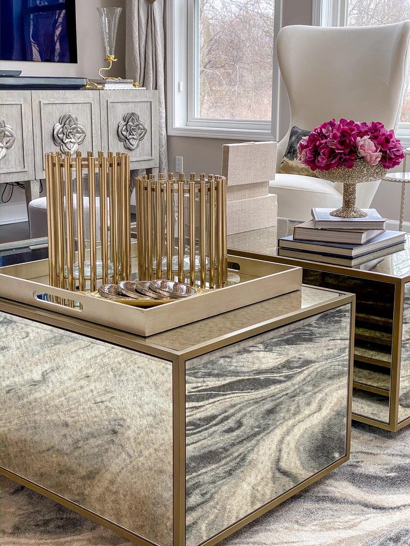 This oversize tray features a mirrored base with a small circle pattern. It is a very substantial piece and is perfect piece for your coffee table