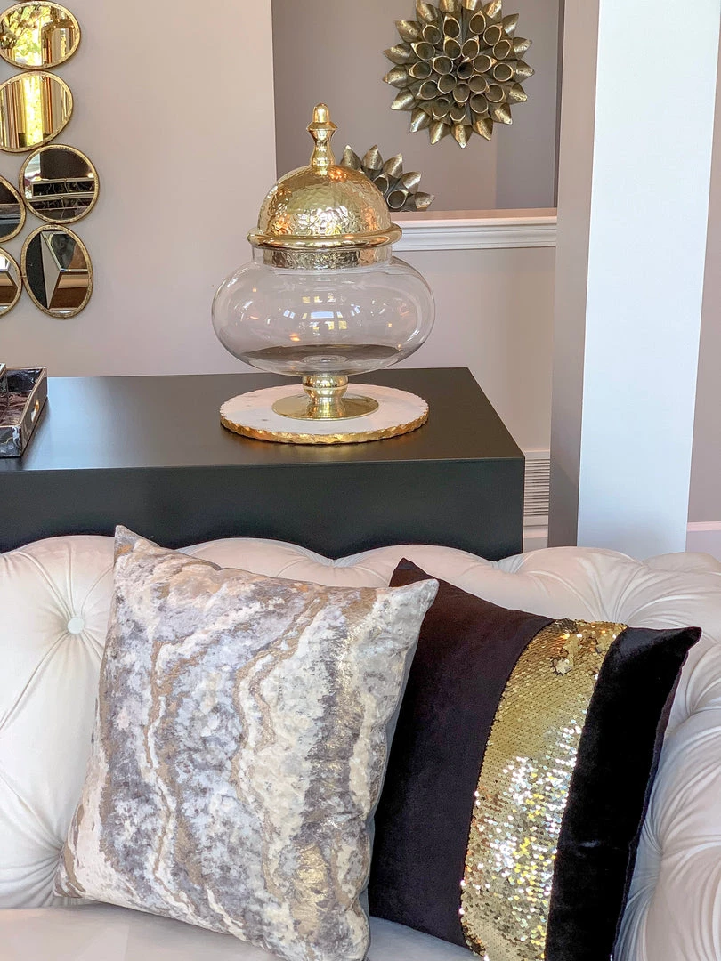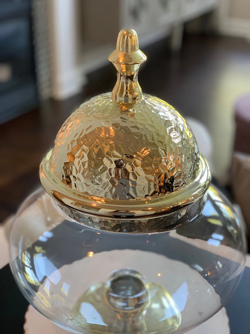 Pictured to the left is this beautiful over-sized Apothecary Jar with an elegant Gold Hammered Lid. Give your family room or any room the classic touch it’s desiring!