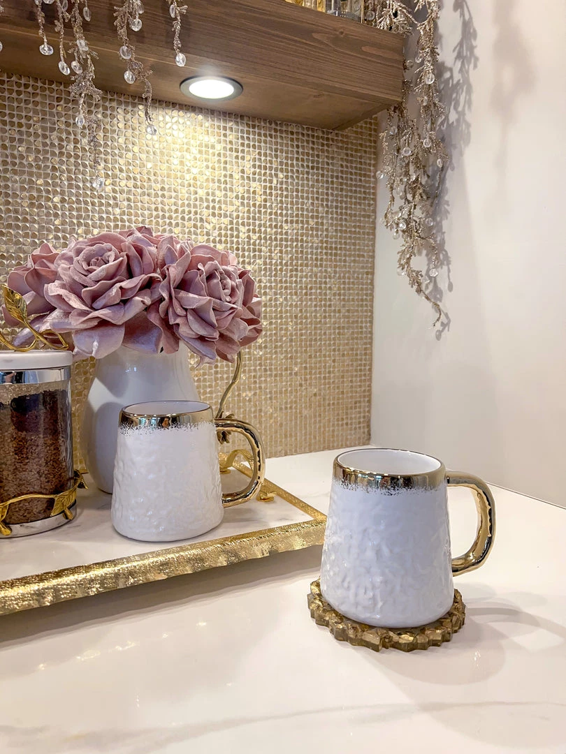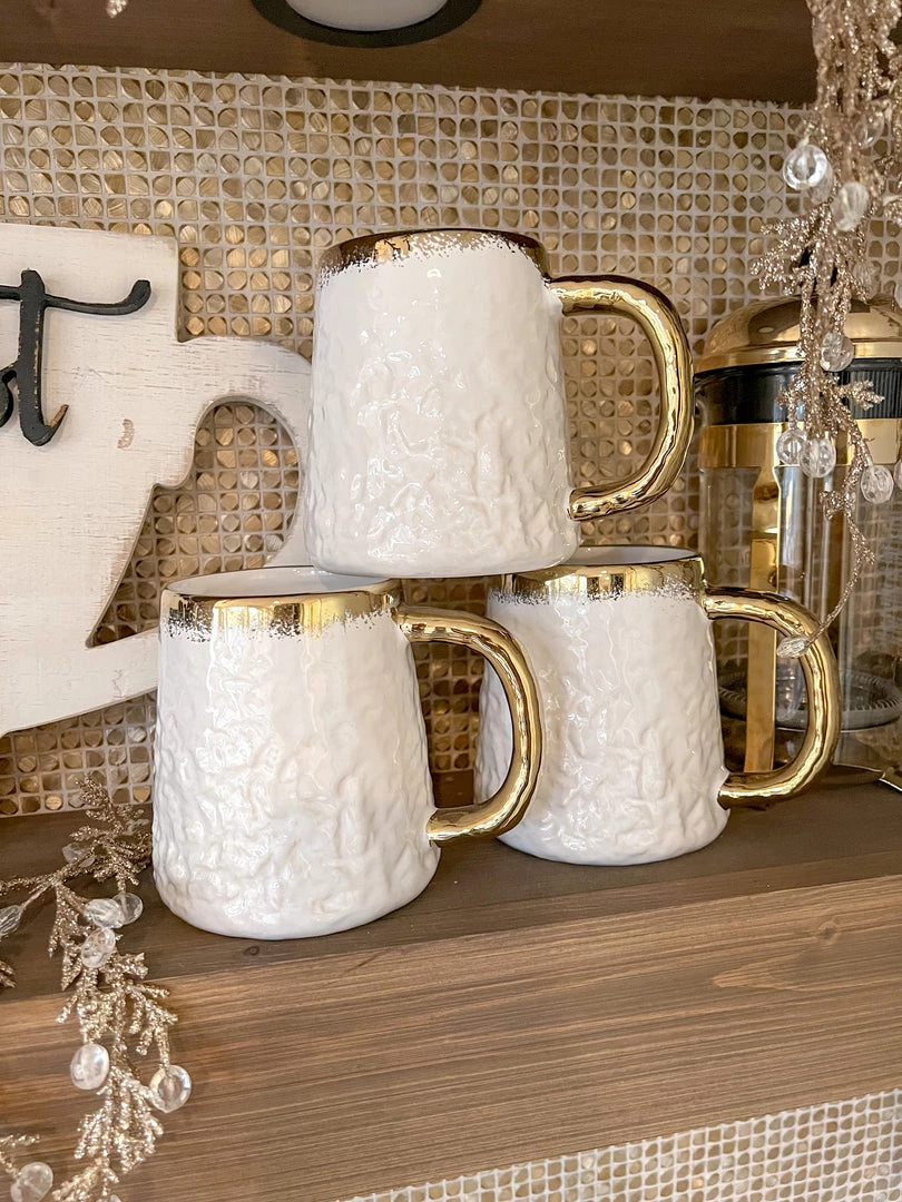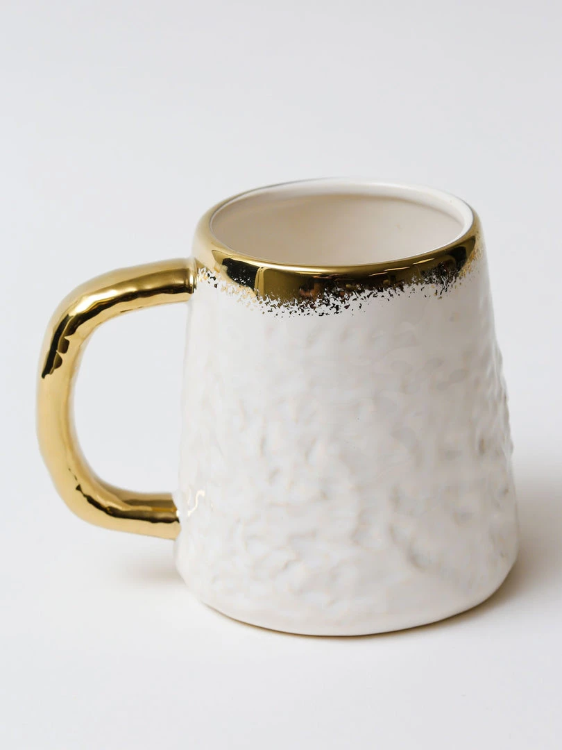 Description: This is a gorgeous oversized white coffee mug with beautiful gold trim.