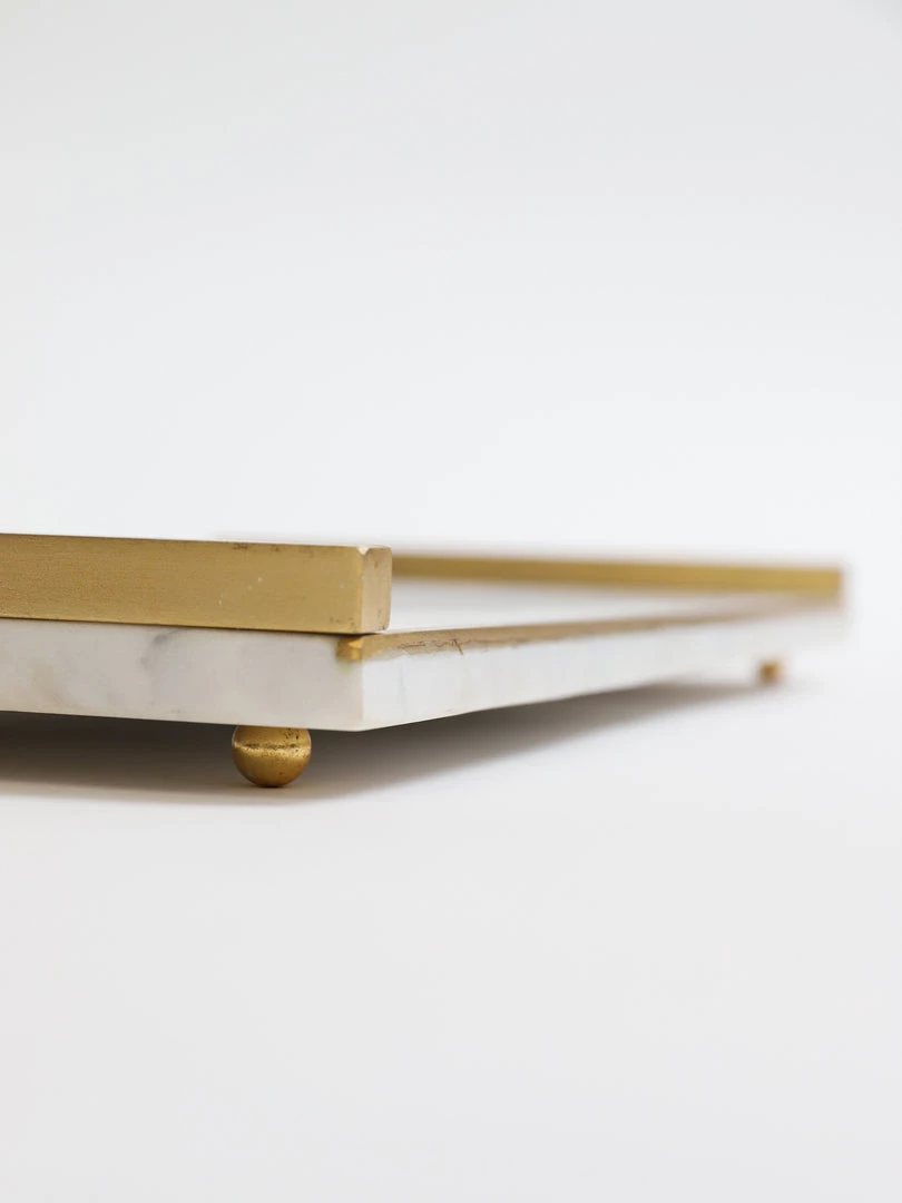 Description: This white marble tray features gold handles and a beautiful gold edge. It is simple yet elegant and very versatile in its use. Perfect to hold your canister sets!