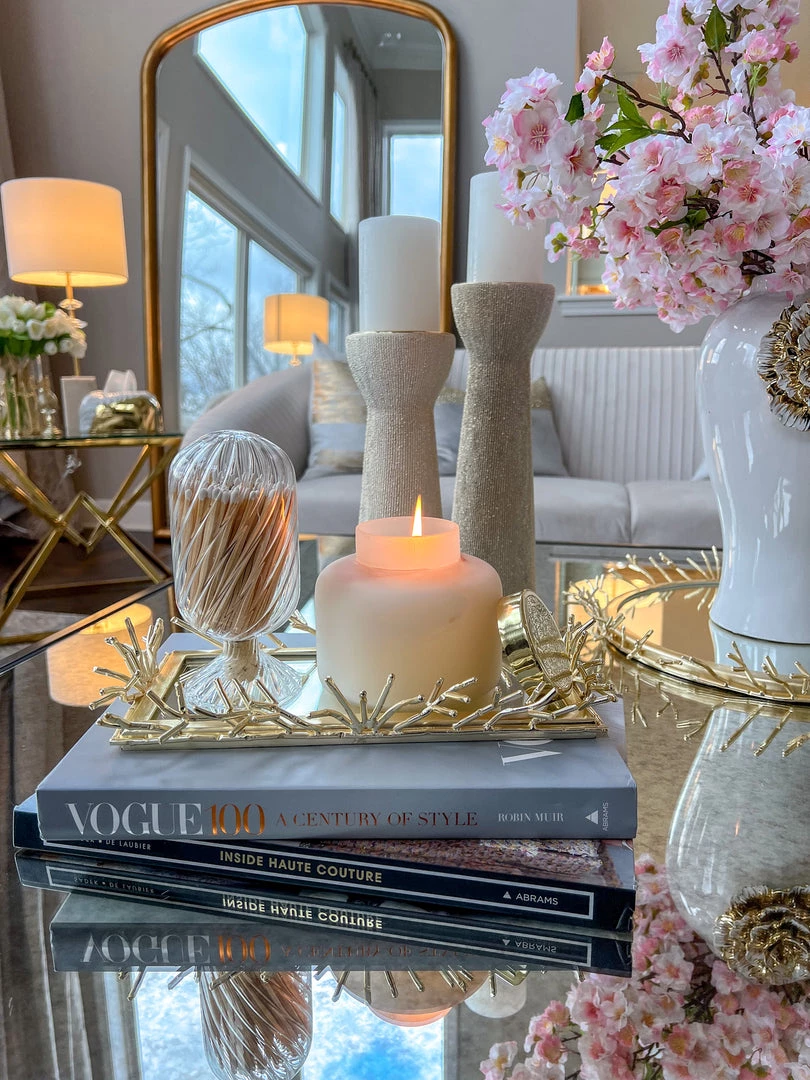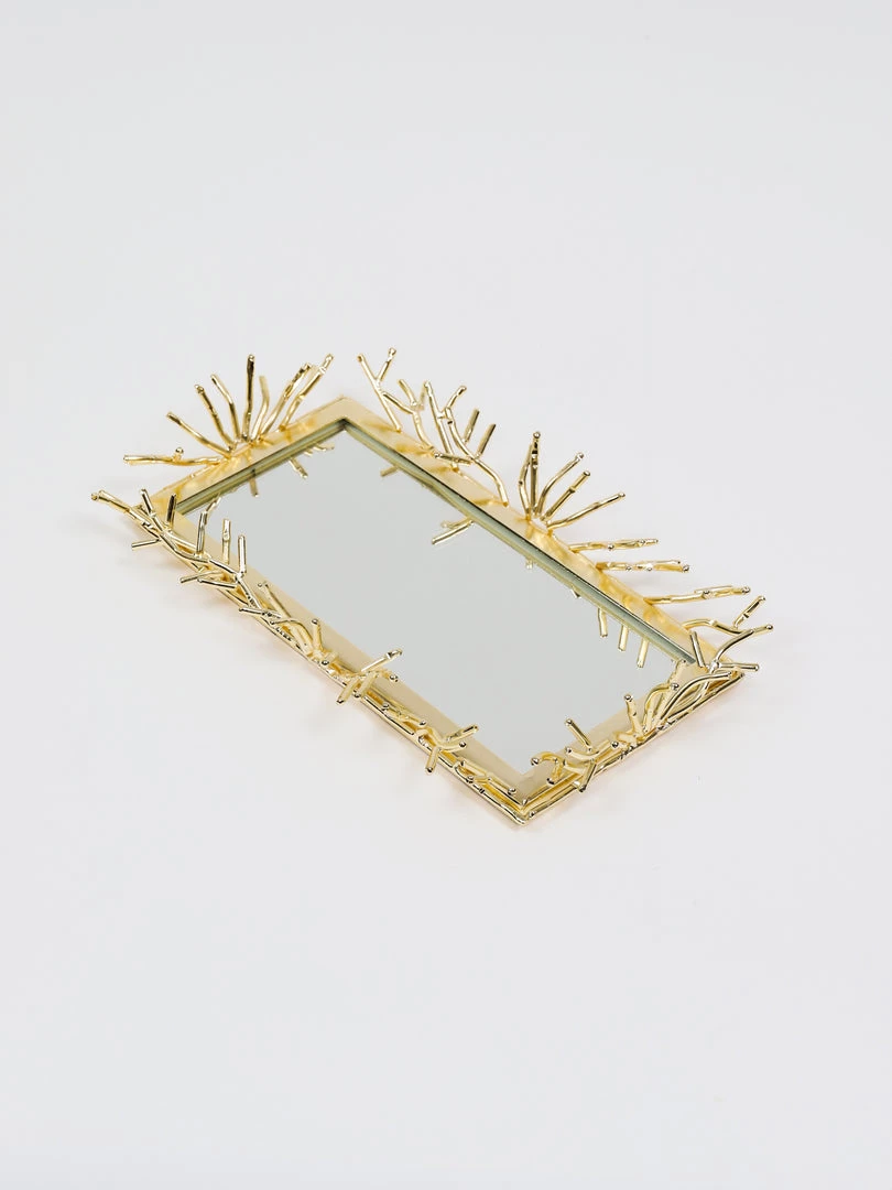 Description: This rectangle mirror tray features a fun textured border that will bring texture and glam to your decor! Perfect to layer with candles and matches!