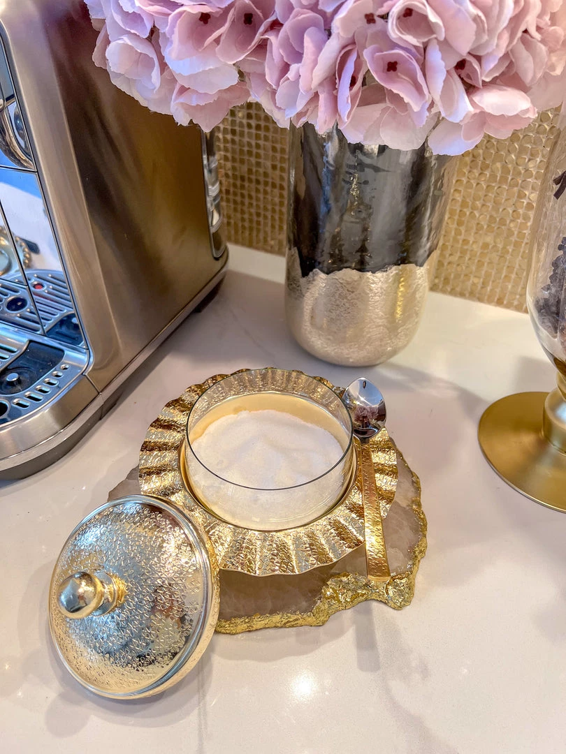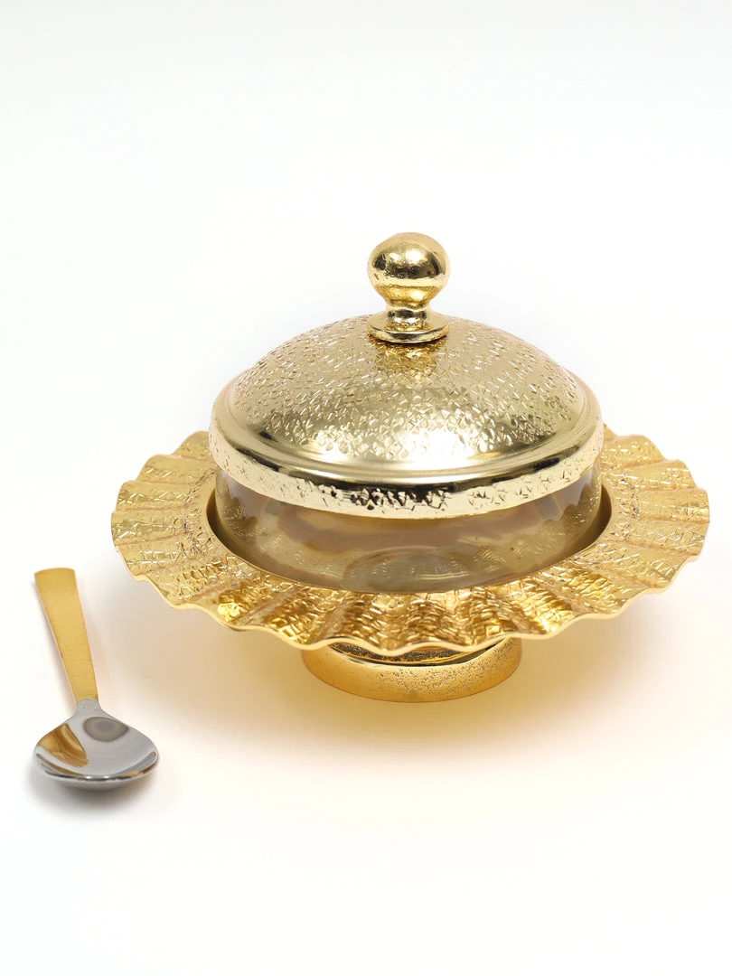 Description: This universal jar has a gold hammered lid and can be used for almost anything! It will be great for sugar, honey, jam, etc. Comes with a matching spoon.