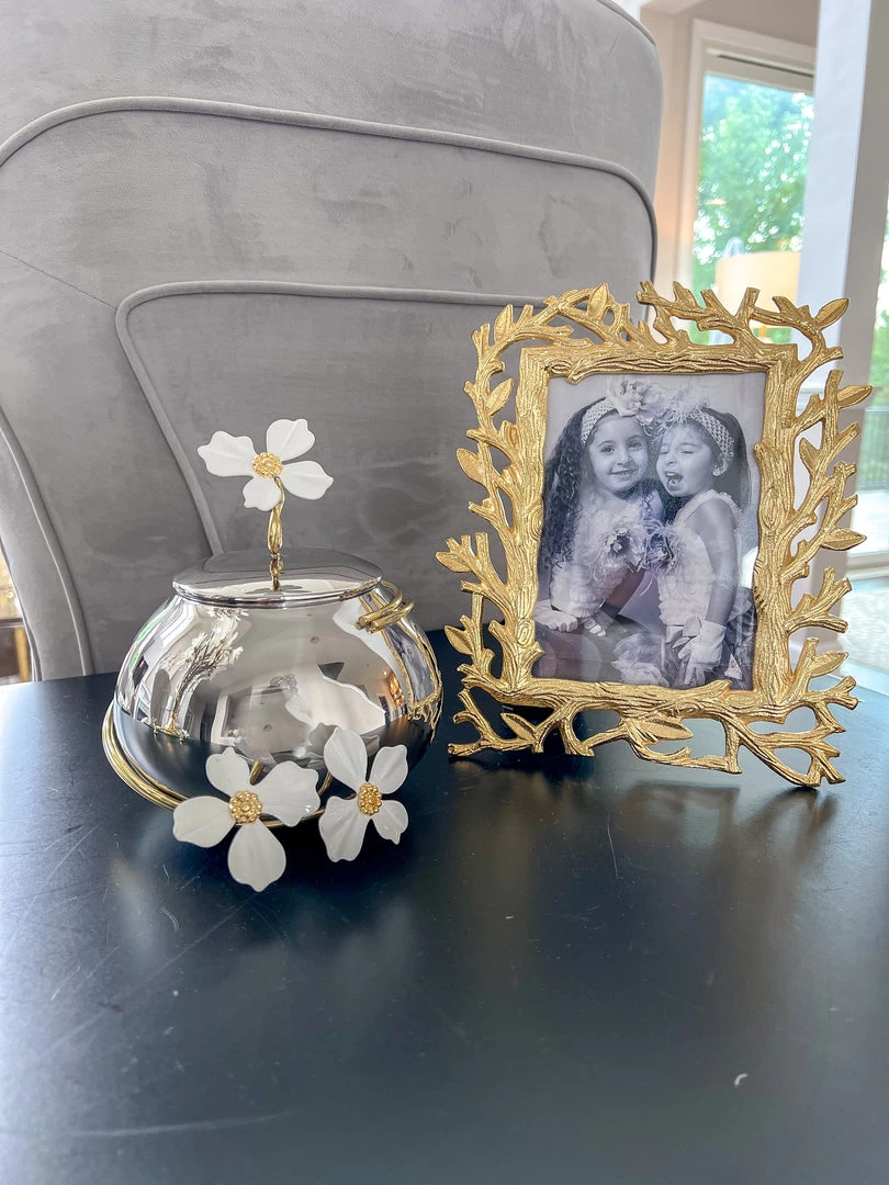 I’m in love with this dish! The white jeweled flower details are so pretty, and it’s the perfect size for small items. The cover is a thoughtful addition, making it practical as well as decorative. It’s a must-have for anyone who loves chic home decor.