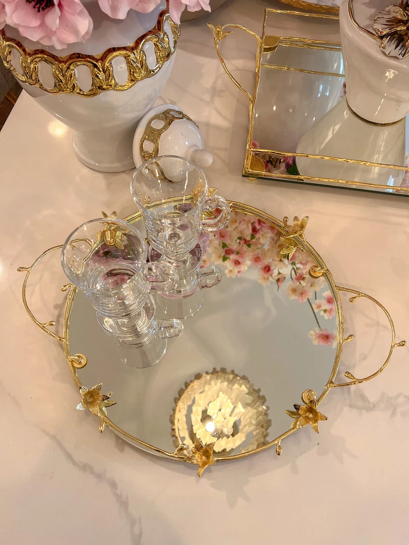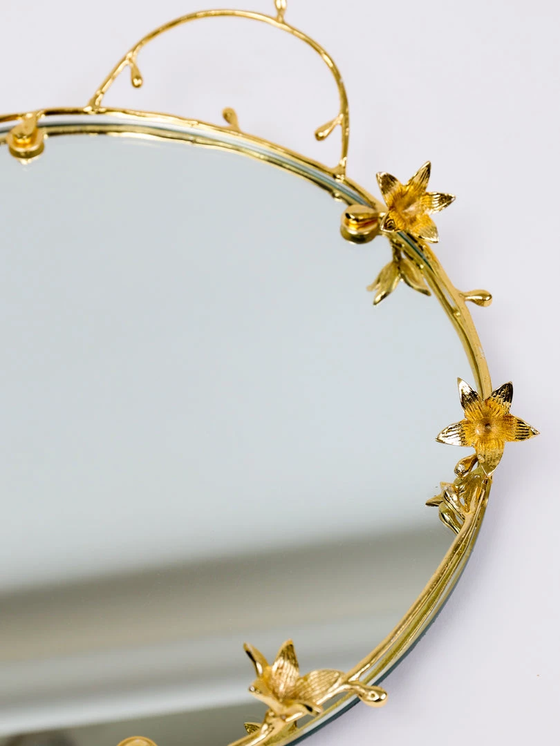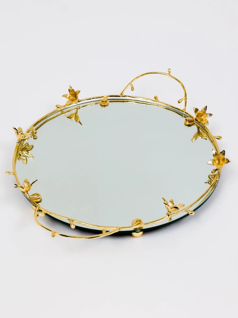 Description: This is a round mirror tray with stunning gold flower details and handles.