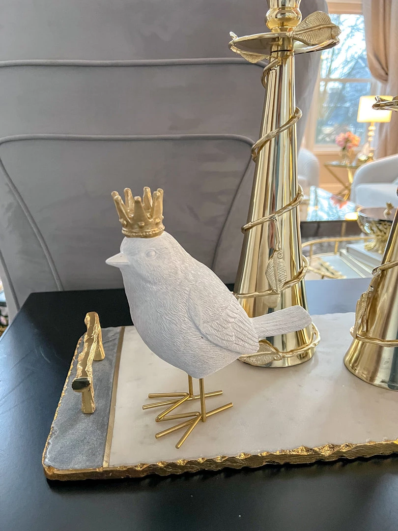 Description: These regal set of 2 birds will add an elegant touch to your home decor. The white birds are topped with little gold crowns, this pair of birds couldn’t be any sweeter!