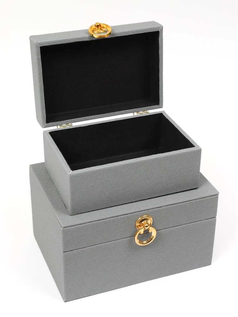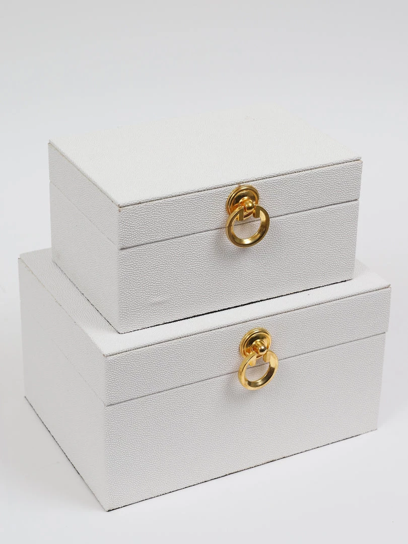 Description: We love the elegant look of the faux leather and the beautiful gold accents! Can be styled together, or separately, and they are great for storing things like remotes and other items.