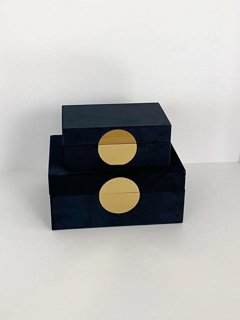Description: Display your treasures in an elegant box! This set of two black velveteen boxes features a gold metal circle on the front of the design to add a touch of color to a sophistcated design.