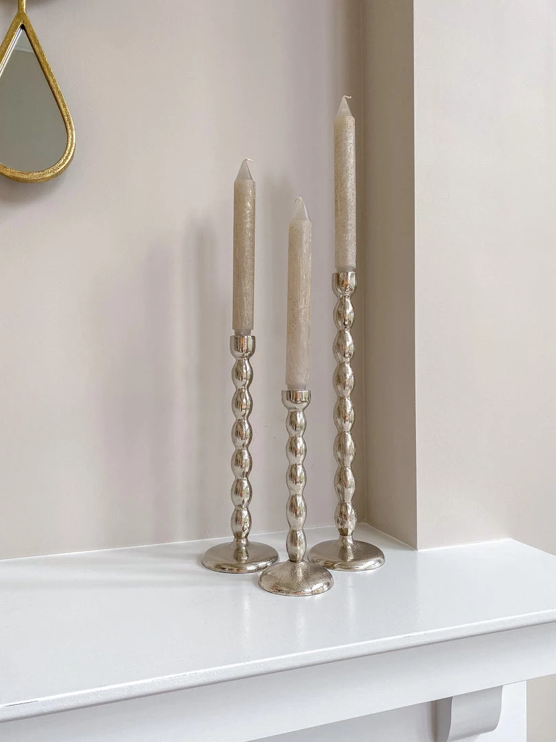 Description: These stunning metallic taper candles will make the perfect addition to your home decor! Featuring shimming flecks of gold, these candles are simple yet very elegant! Available in 4 colors!