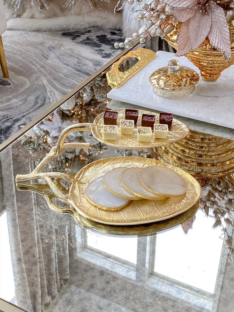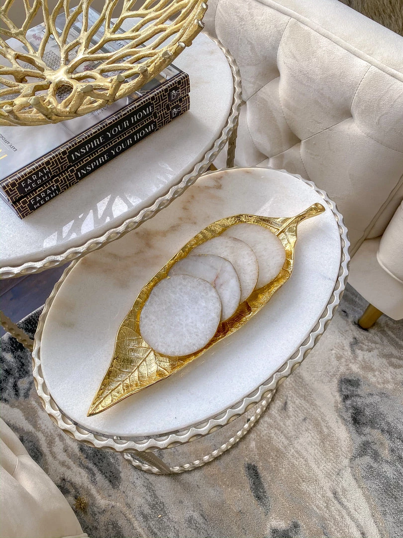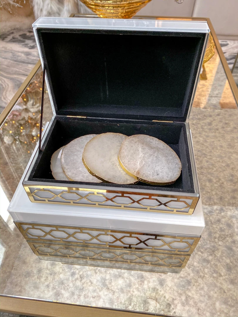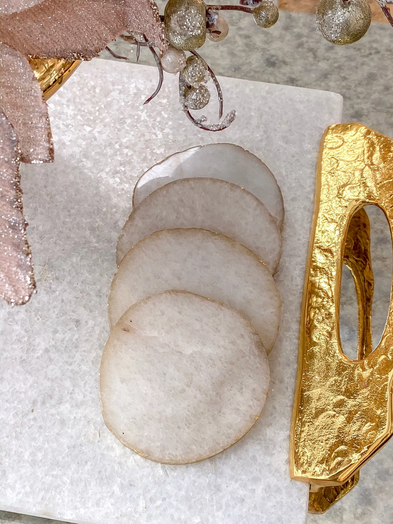 Description: Real quartz coasters with beautiful distressed gold detail for an elegant touch to any surface in your home!
