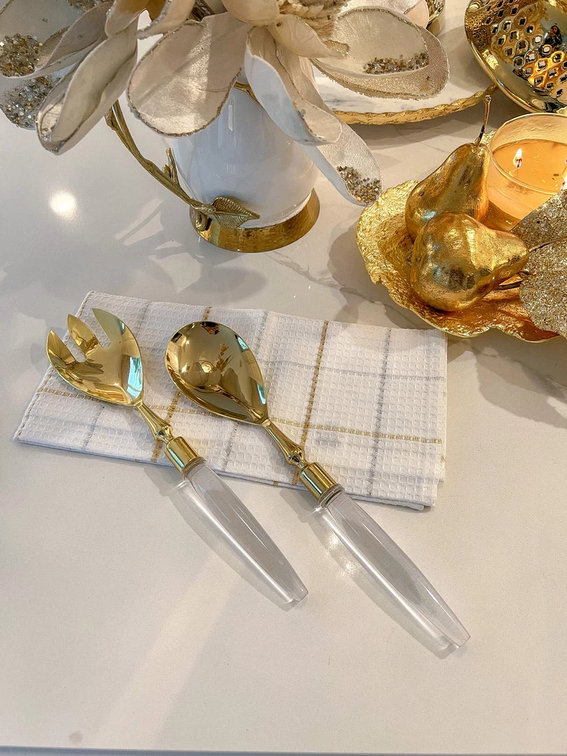 Description: These gold salad servers style well with any serveware collection! The stunning gold design with the acrylic handles provide a simple and elegant look for your dinner parties!