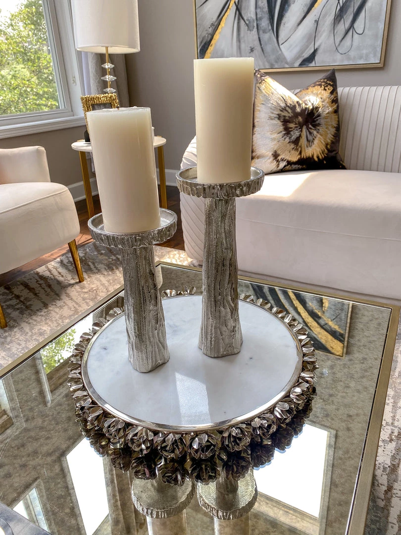 Description: These branch detail candle holders are a perfect organic accessory! Available in 2 sizes, and in Gold or Silver!