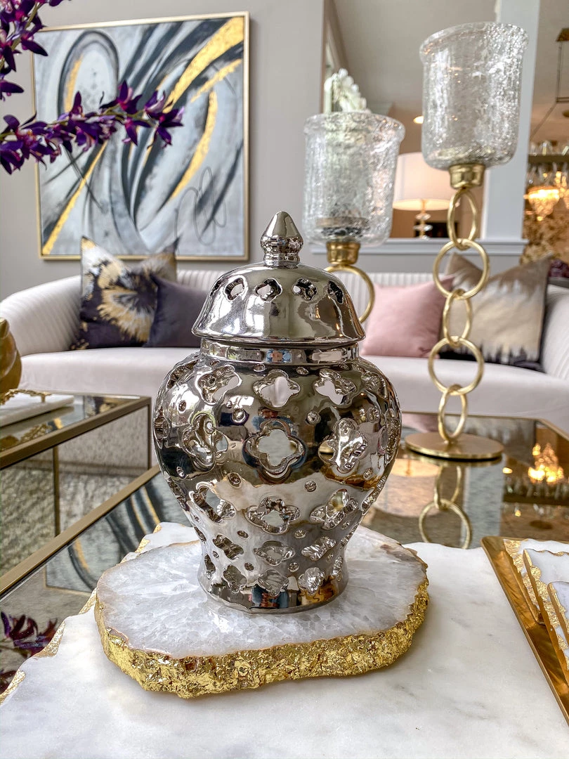 Description: Want the classy look of a ginger jar but don’t have the space? This extra mini silver ginger jar is perfect for you! Standing at only 9.5 inches tall, this is perfect for tabletop decor, or will make a great detail on a desk in your office space! Classic elegance at the smallest scale!