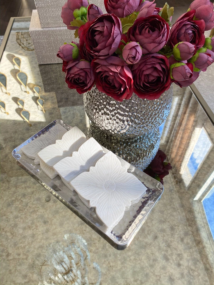 Description: This silver metal tray is the perefect size for dispalying any of our coasters or candles!