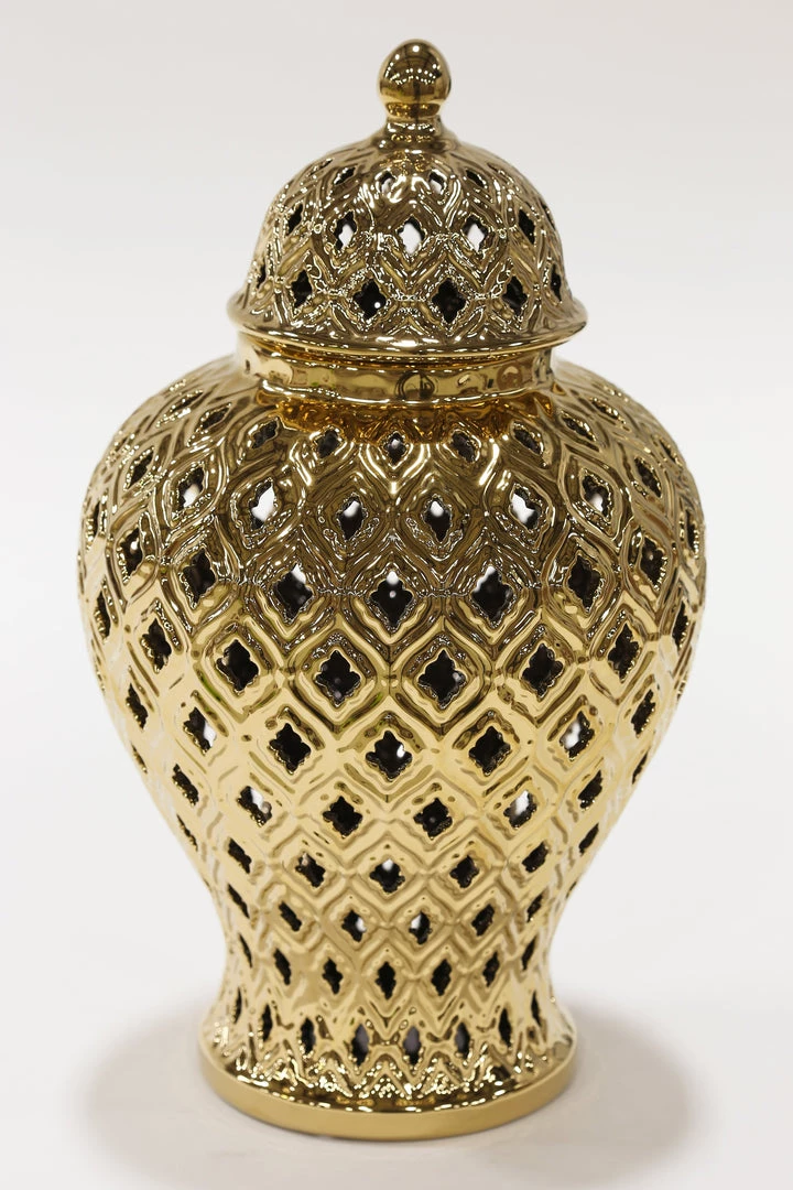 Description: If you want the look of an elegant ginger jar but don’t have the space, this beautiful gold miniature ginger jar is the perfect solution! Standing at 13″ tall, this golden ginger jar is perfect for a desk or small table, and still gives you that classic look!