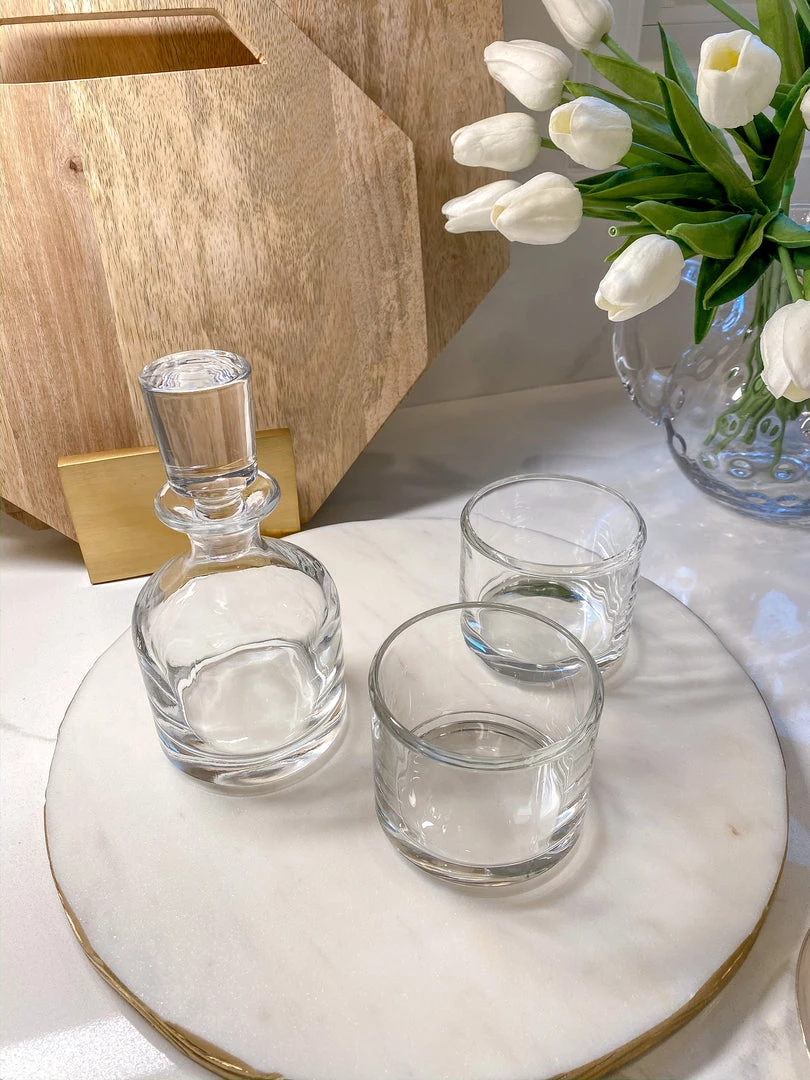 Description: This beautiful glass decanter is a truly unique piece! The decanter is stackable and comes with 2 additional cups! It makes for easy storage and a beautiful design!