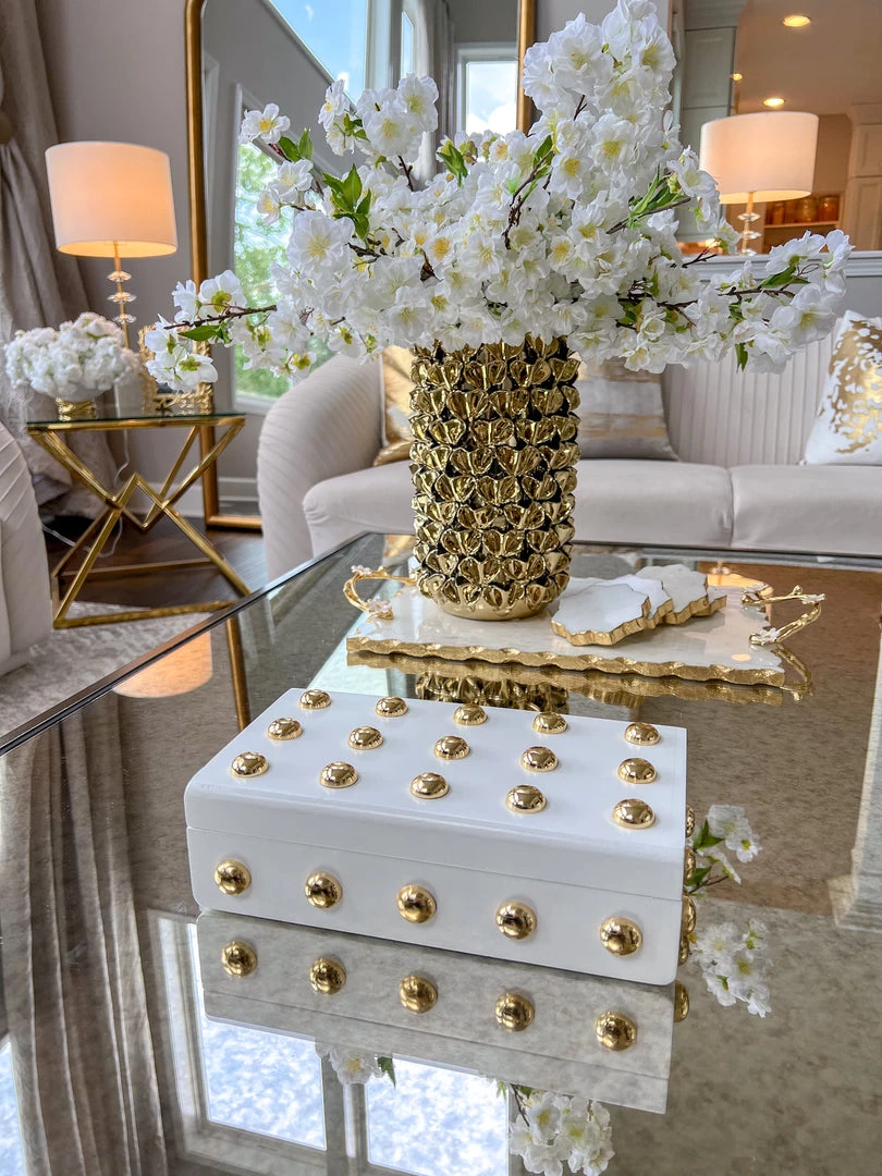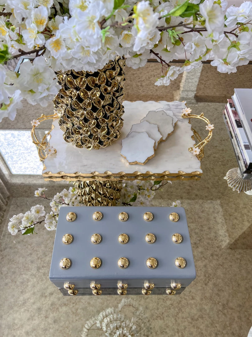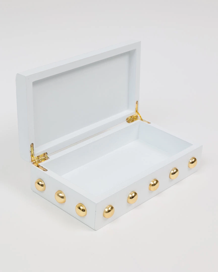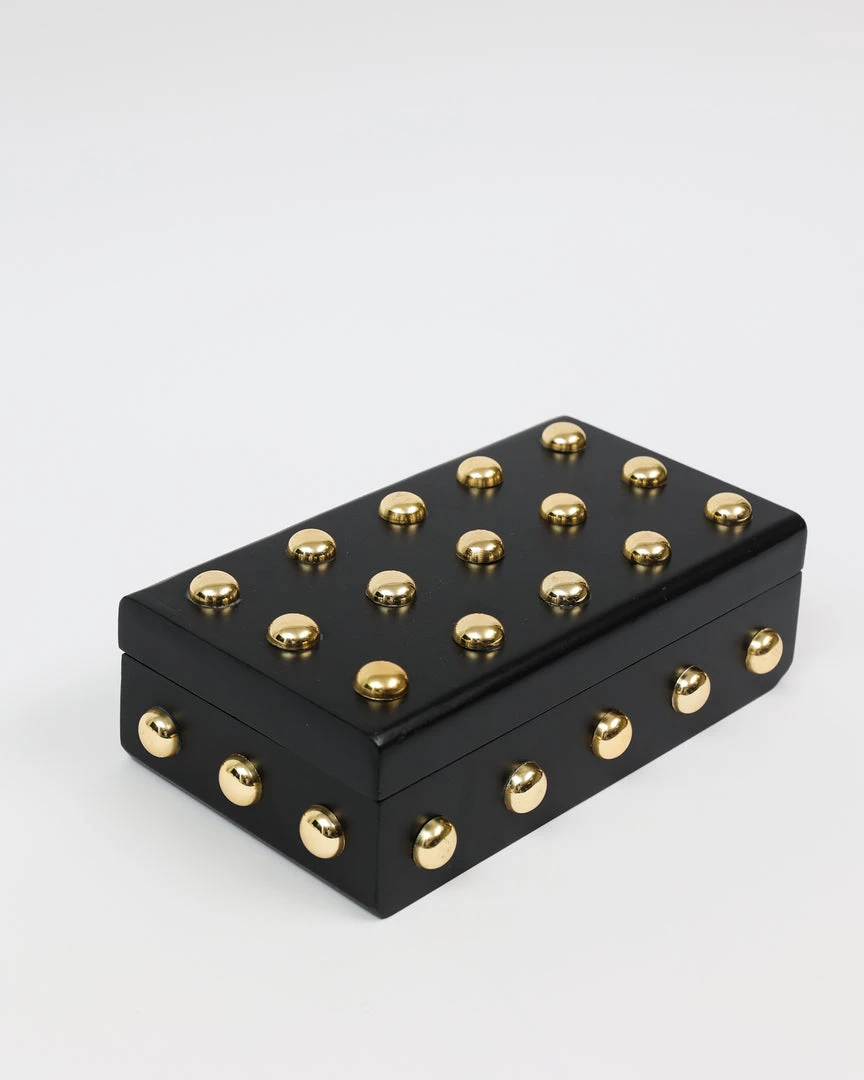 Description: This wooden box with its shiny gold studs is a statement maker.