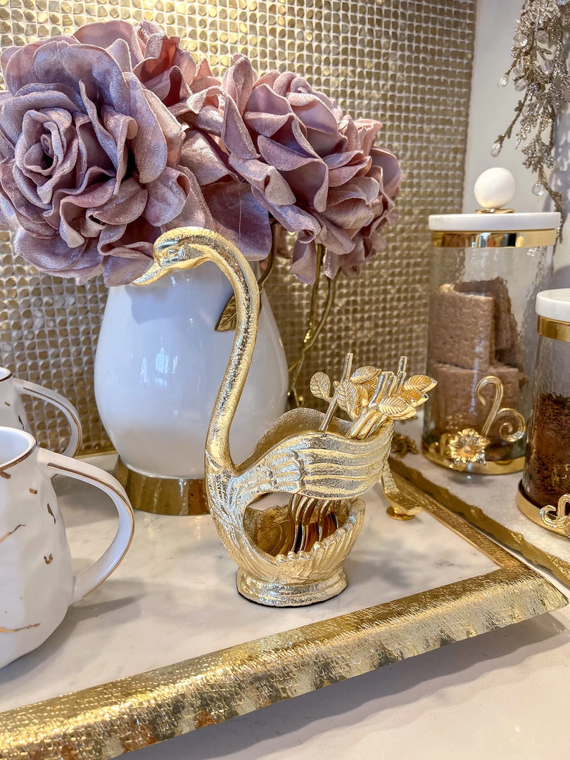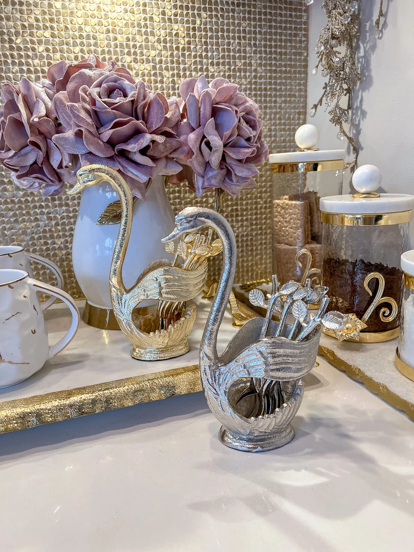Description: This is such a stunning swan spoon holder which holds 6 intricate dessert spoons. This will be a welcome addition to your dessert station.