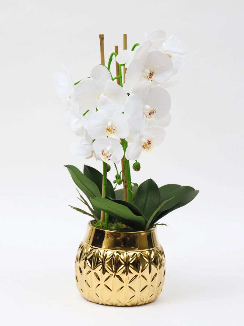 Description: This gold potted faux white Orchid is perfect for every season’s decor! The size is perfect for placing anywhere around your home!