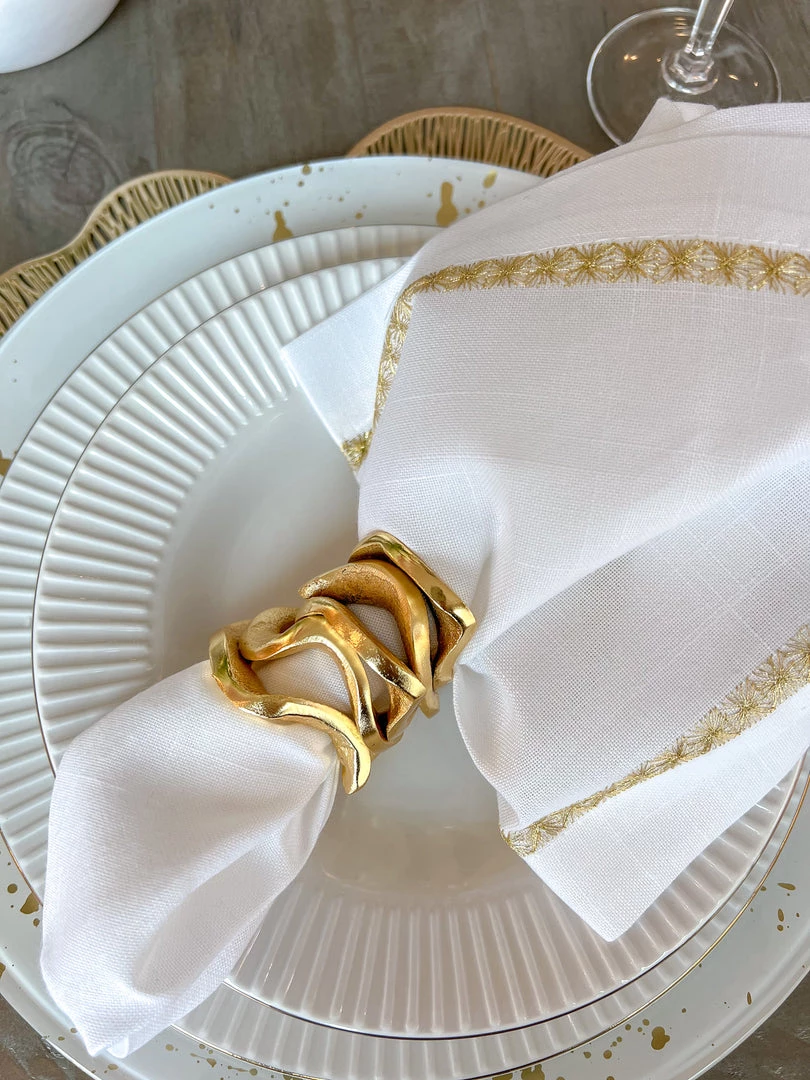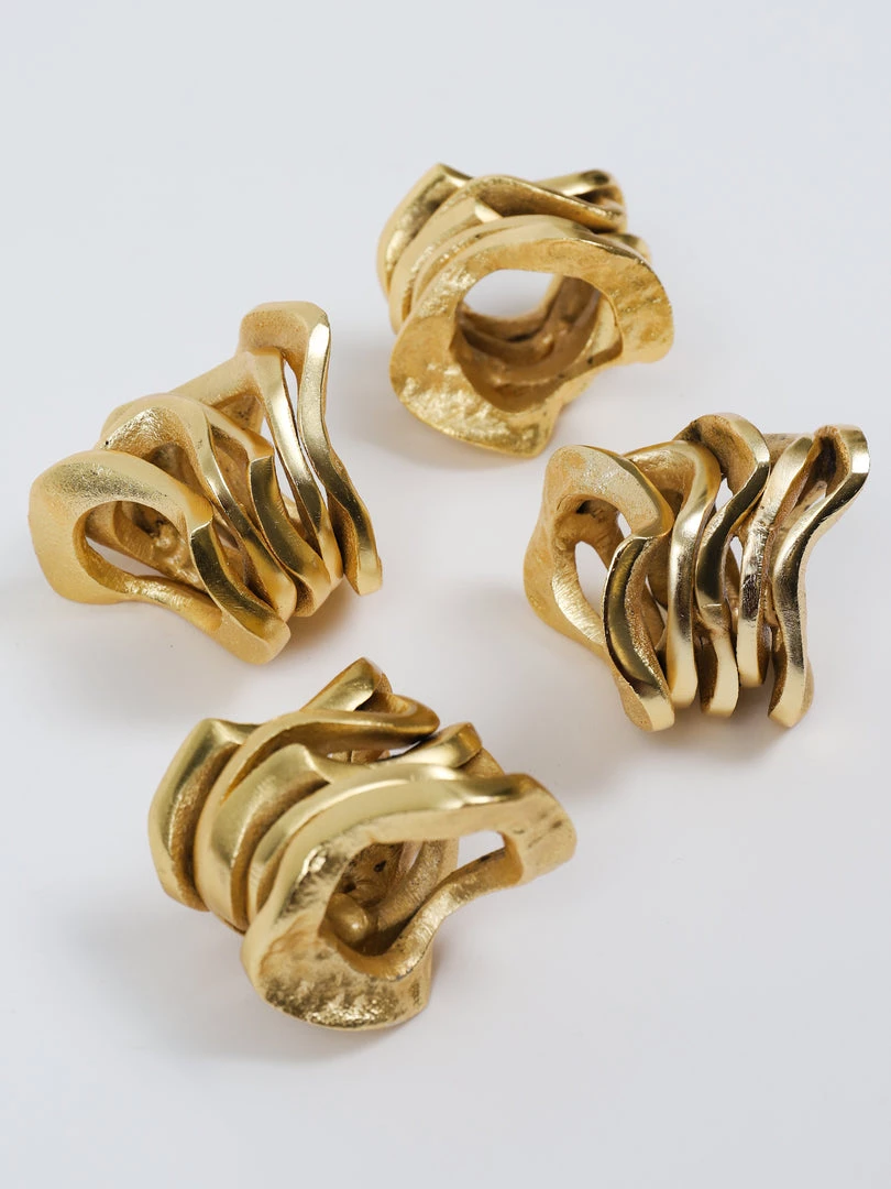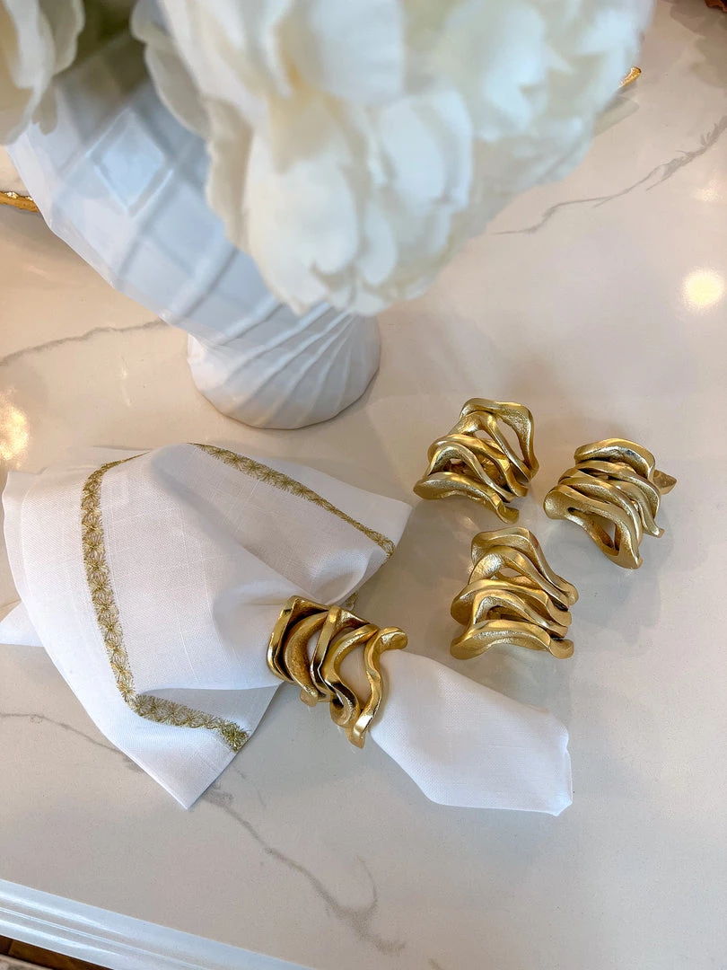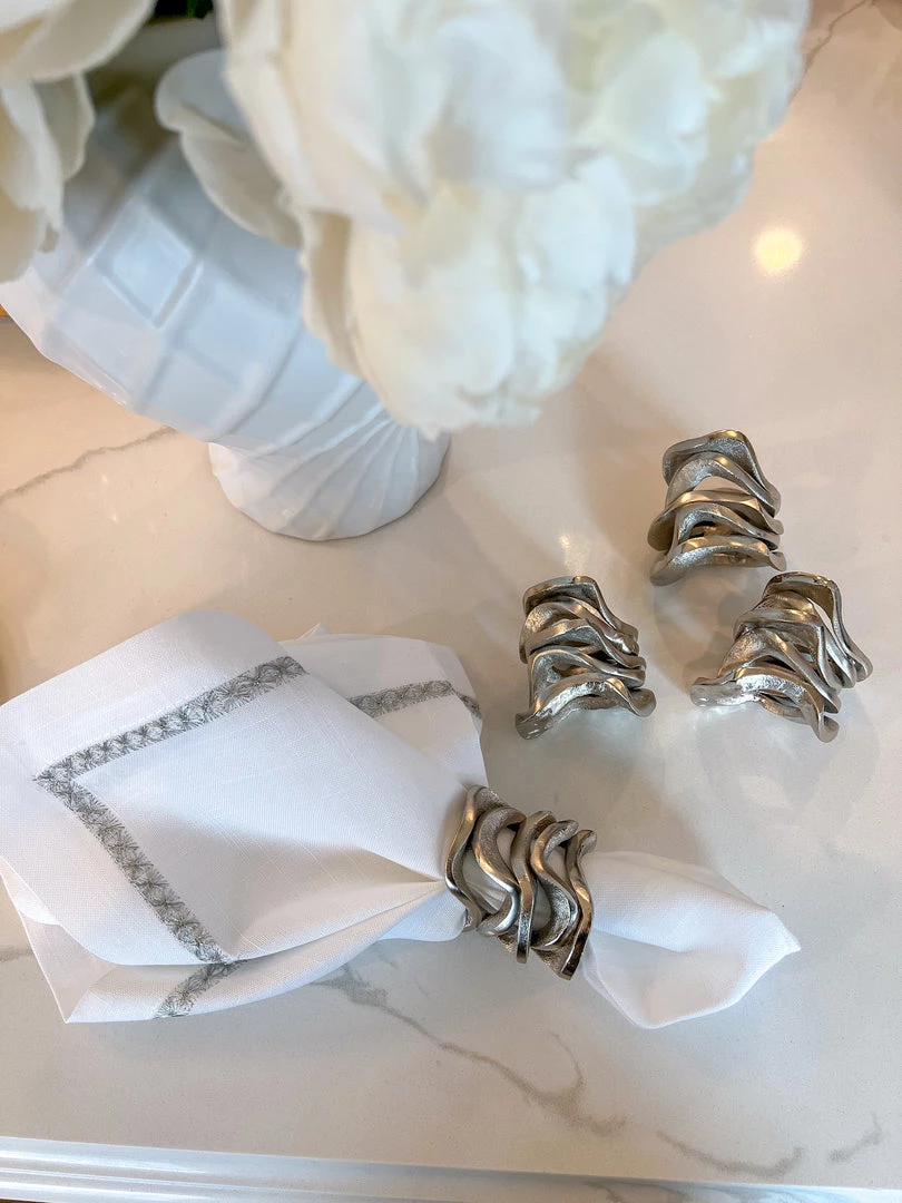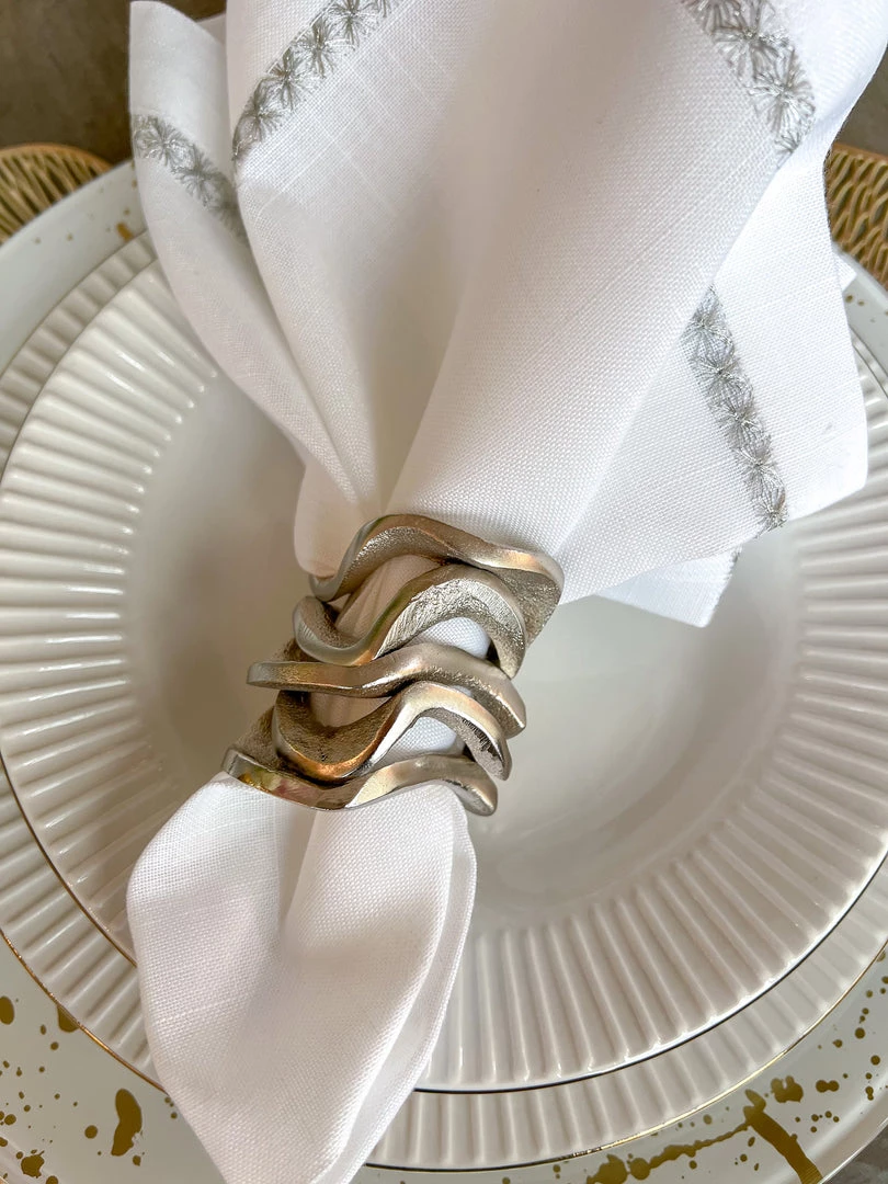 Description: These all-metal substantial wavy stacked napkin rings are absolutely stunning and will make a statement on your dining table!