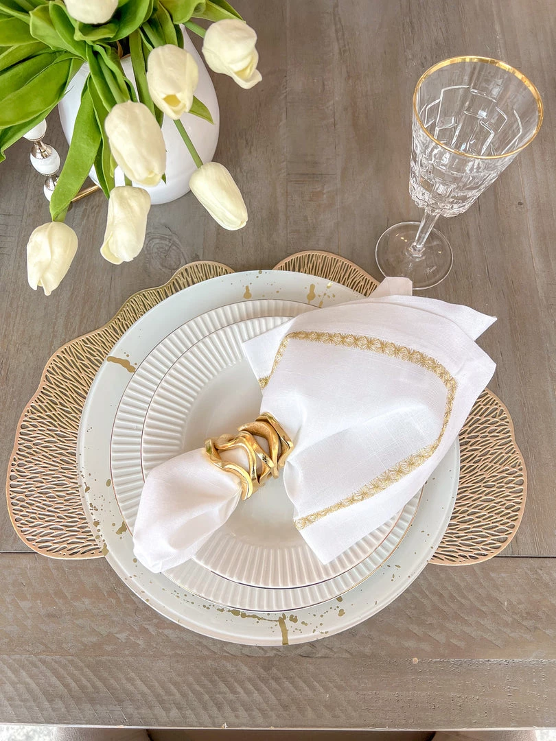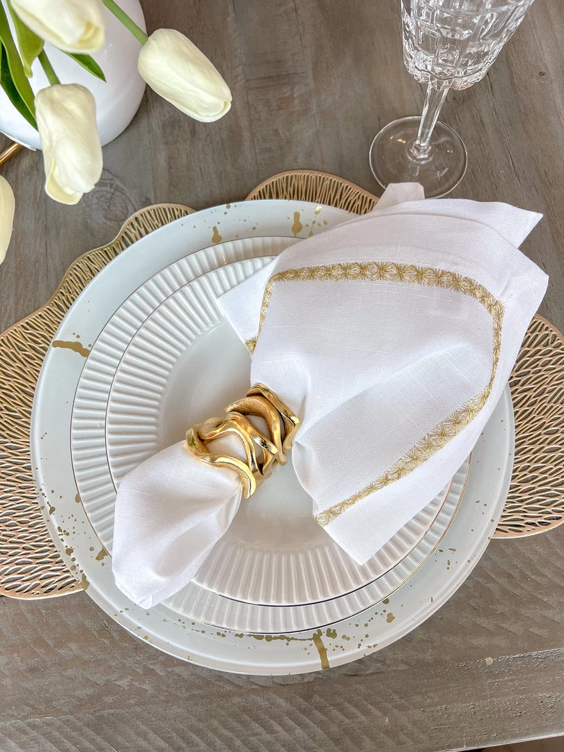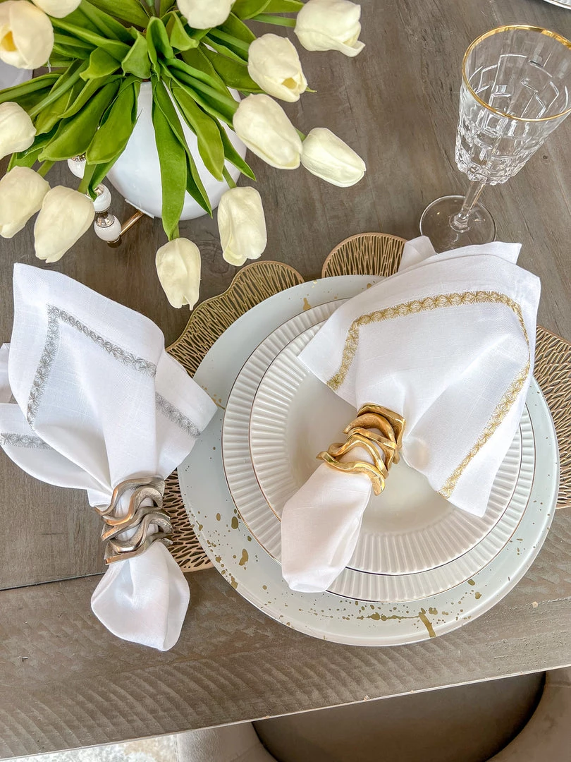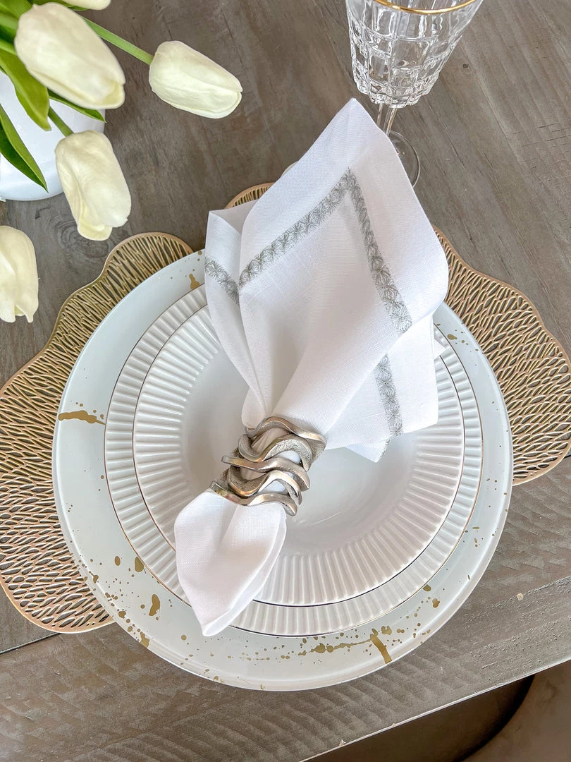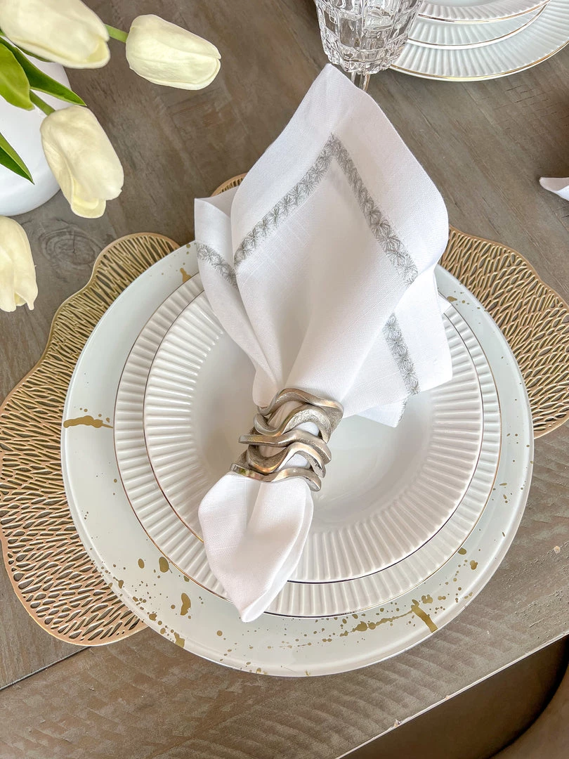 Description: These all-metal substantial wavy stacked napkin rings are absolutely stunning and will make a statement on your dining table!