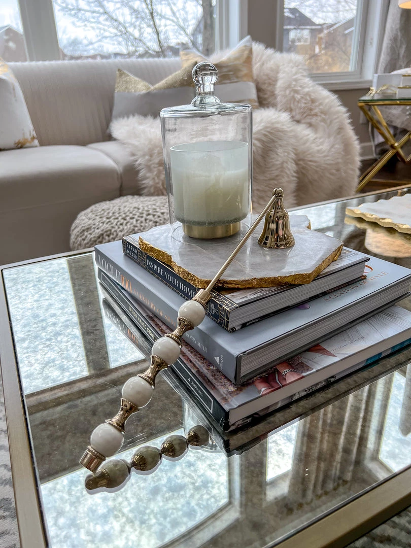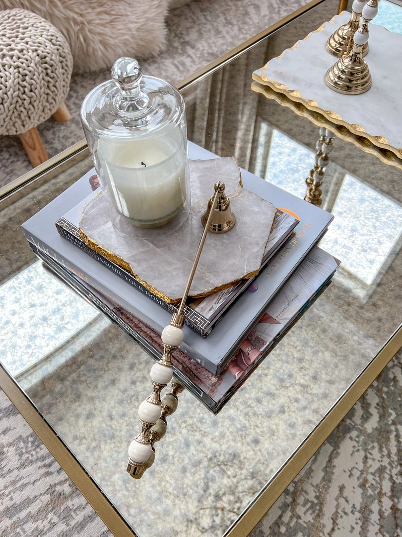 Description: This Gold and white beaded candle snuffer ties back to our candlesticks! We love the intricate design and how it will look next to your favorite candle.