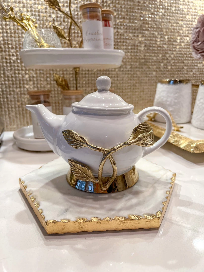 Description: This tea pot will make an elegant setting for tea time. The is a beautiful white design with gold leaf details and a gold base.