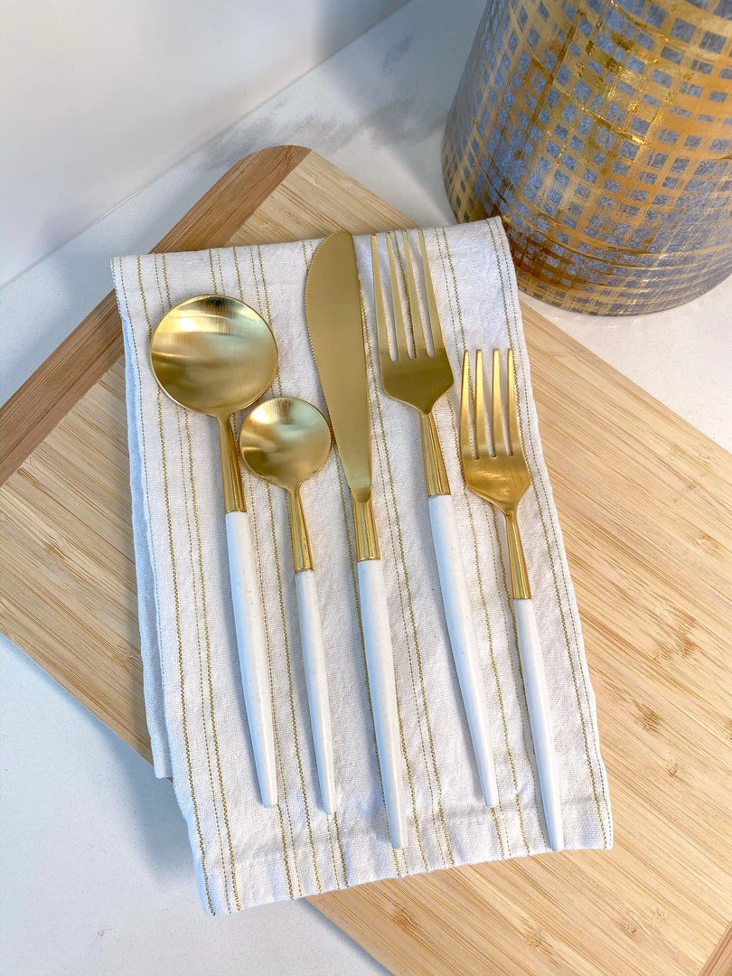 Description: Your dining display just got classier! This beautiful set of white and gold toned flatware is a beautiful and elegant way to serve your favorite meals! Each set comes with a butter knife, dinner spoon, dessert spoon, dinner fork, and dessert fork.