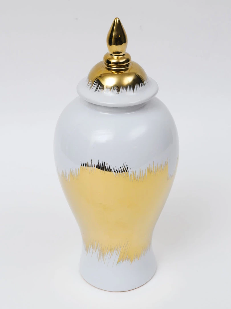 Description: This newest style white and gold ginger jar is a must-have! This sleek style will compliment any other style well.